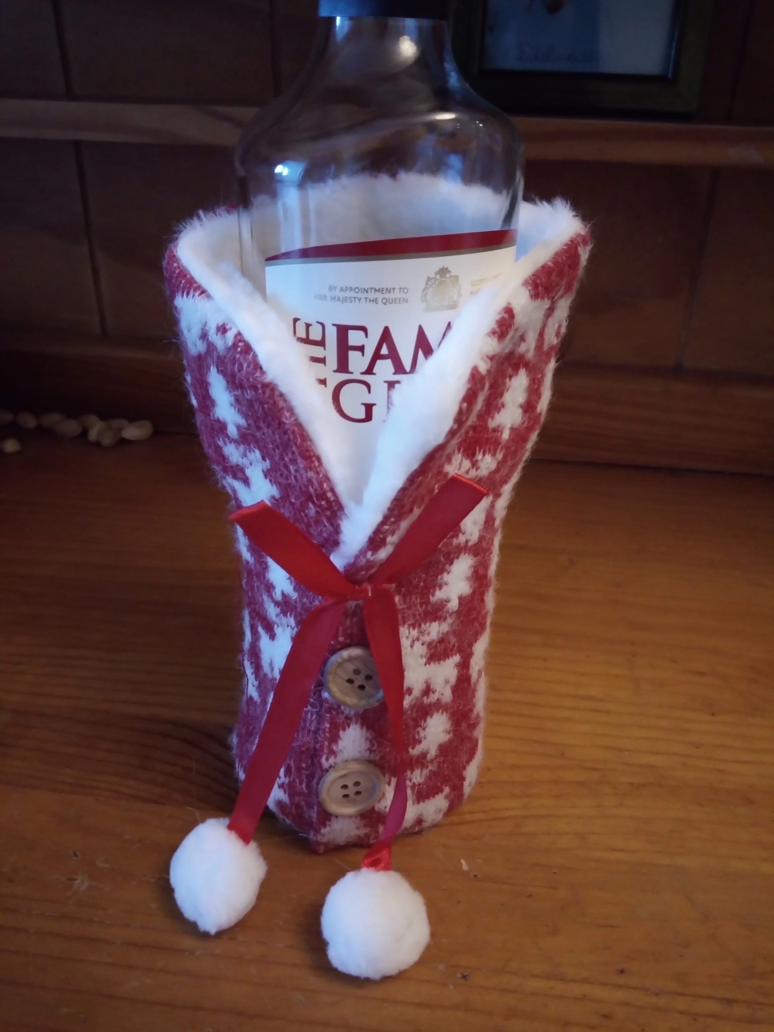 соответстствует описанию. рисунок как на картинке. с двух сторон. сшито аккуратно. шов внутри. спокойно влезкт бутылка вина или шампанского.