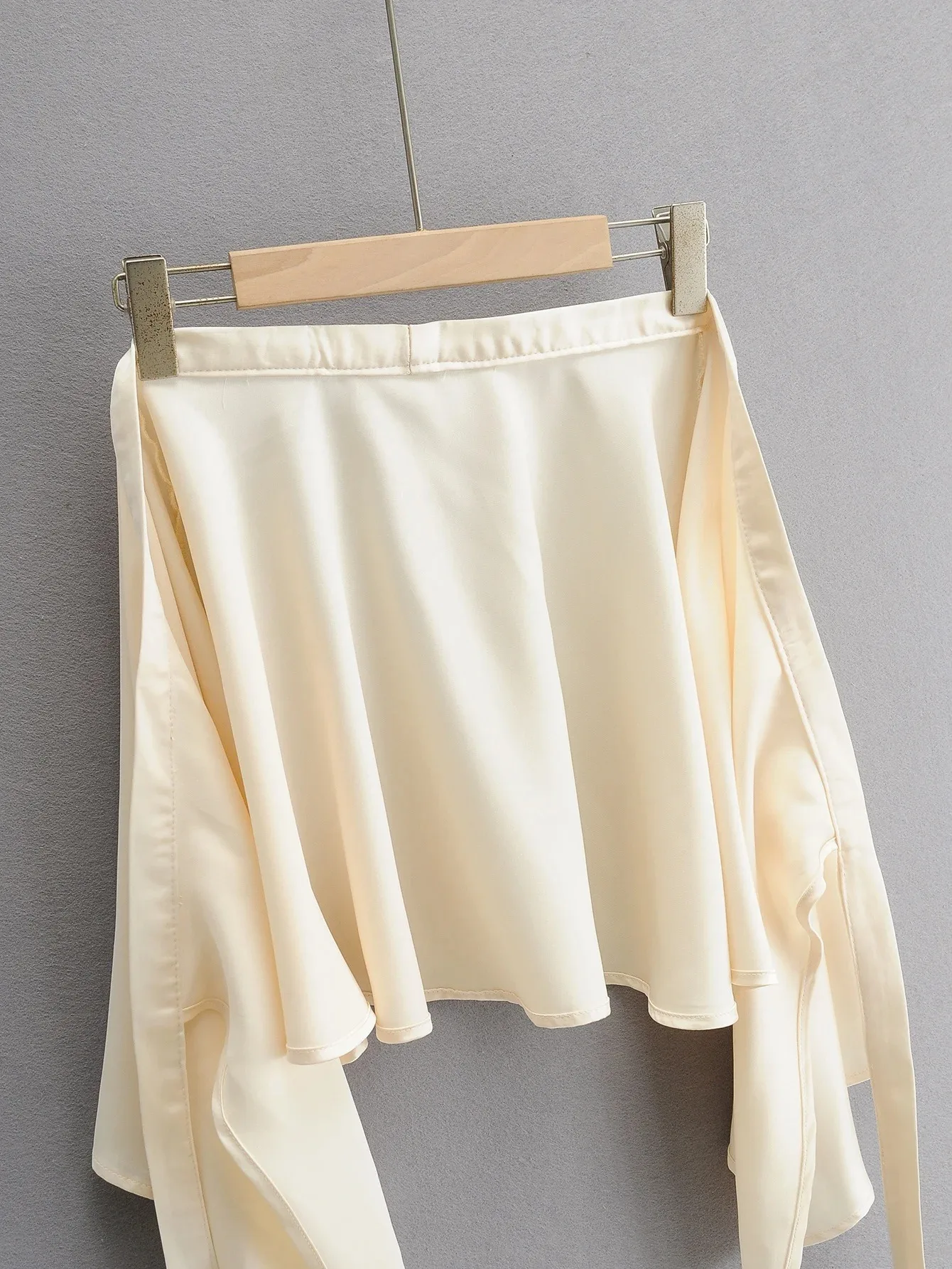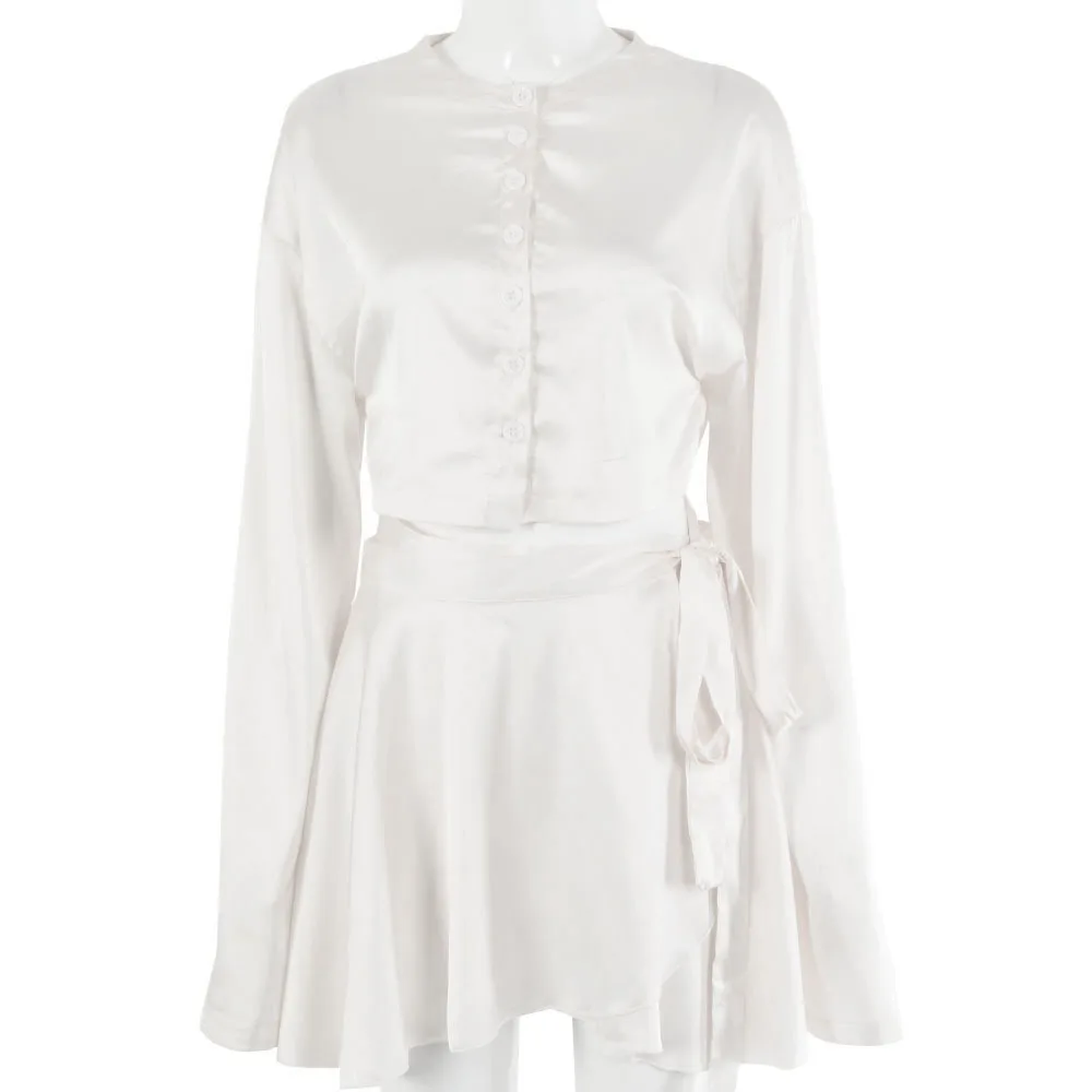 Комплект из двух предметов женский атласный, элегантный укороченный топ с длинными рукавами-фонариками, пикантная ТЕННИСНАЯ СПОРТИВНАЯ мини-юбка с завышенной талией, белый комплект из 2 предметов, 2021