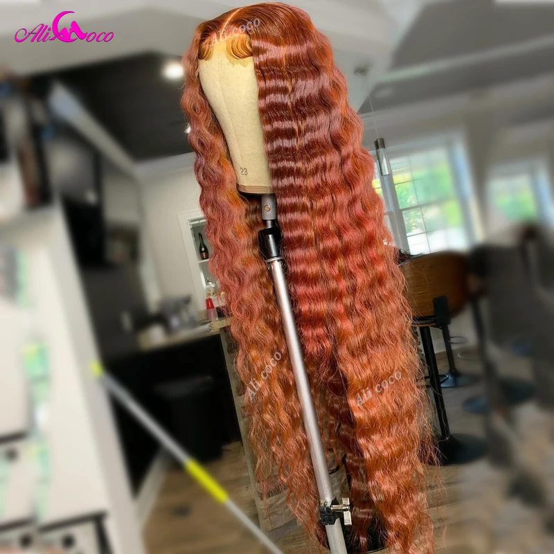 Али Коко оранжевый имбирь красный глубокая волна человеческие волосы парики фронта шнурка бразильские Remy глубокая волна парики предварительно выщипанные 5x5 человеческие волосы парик