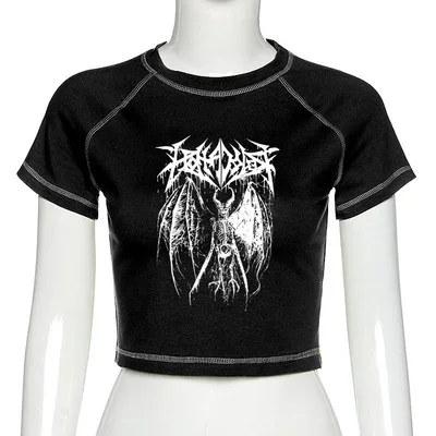 Женская футболка Harajuku Y2K, укороченный топ в стиле Харадзюку, ретро, корейский, черный, демон, панк, готический, одежда с аниме-принтом, приталенная