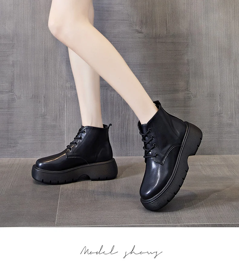 Модные ботинки на платформе; Обувь на массивном каблуке; Цвет Черный; Коллекция 2021 года; Сезон осень; Уличная обувь с круглым носком на шнуровке; Короткие женские мотоботы в стиле ретро