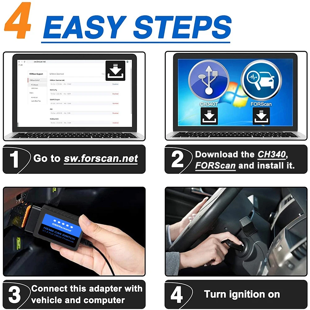 1. Нет CD-диска, мы отправим вам ссылку для загрузки USB драйвера и программного обеспечения, или, пожалуйста, загрузите, пожалуйста, следуйте инструкции пользователя.2. Пожалуйста, выполните 【 CH340 】 драйвер USB в качестве administrator при установке.3. Этот сканер USB OBD2 работает только на компьютере windows, а не на смартфоне.4. Переключите переключатель, чтобы HS-CAN положение при первом подключении.5. 【Новый 2019 + Mazda 3 и CX-30 не поддерживает