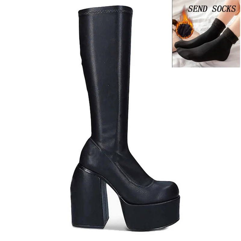 Женские сапоги выше колена на платформе и высоком каблуке, уличные ...