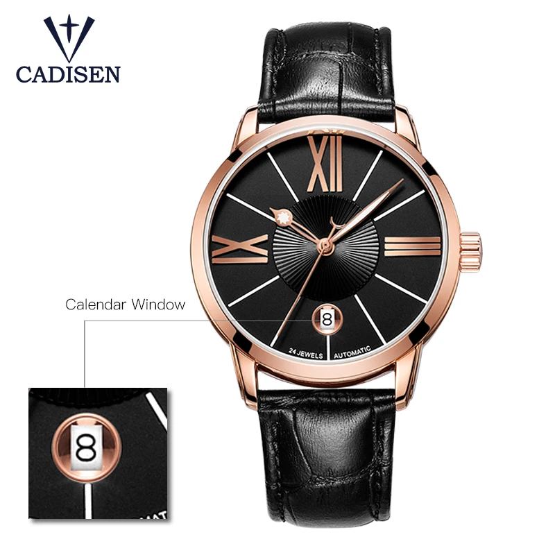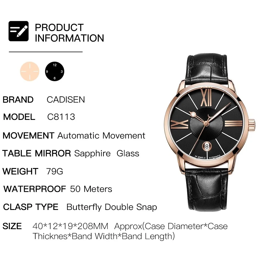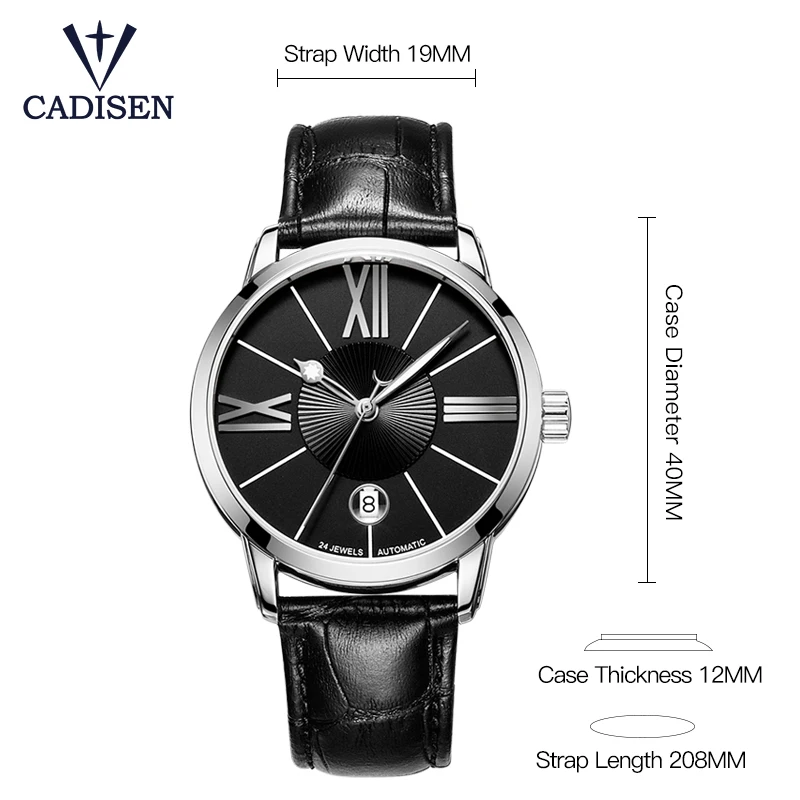 Детали:-NH35A полностью автоматический механический механизм-Сапфировое стекло-Чехол из нержавеющей стали-Ремешок из натуральной кожи-Водонепроницаемая глубина 50 метров-Независимый дисплей календаря-Светящаяся указкаПараметры:-Диаметр циферблата: 40 мм-Толщина циферблата: 12 мм-Ширина ремешка: 29 мм-Длина ремешка: 202 ммПосылка содержит:-Новые оригинальные часы с коробкой-Кусок чистящей ткани-Гарантийный талон-Инструкция по эксплуатации