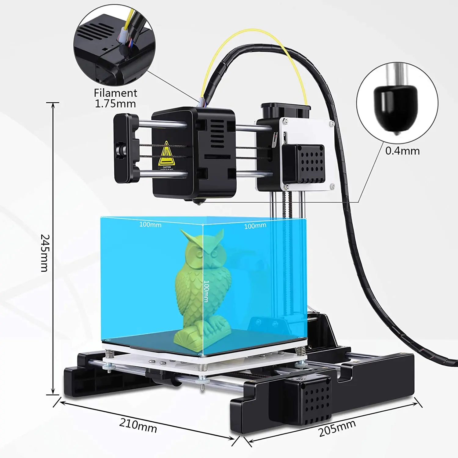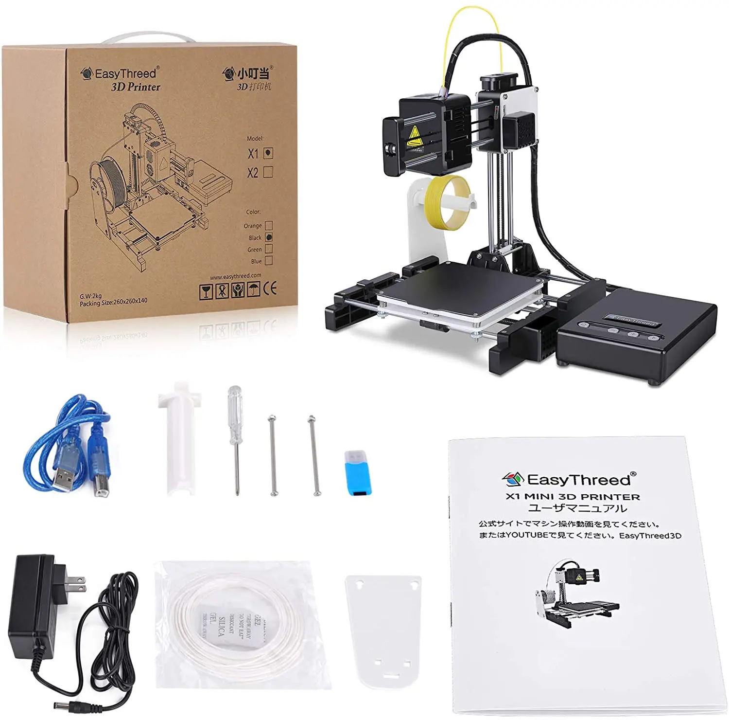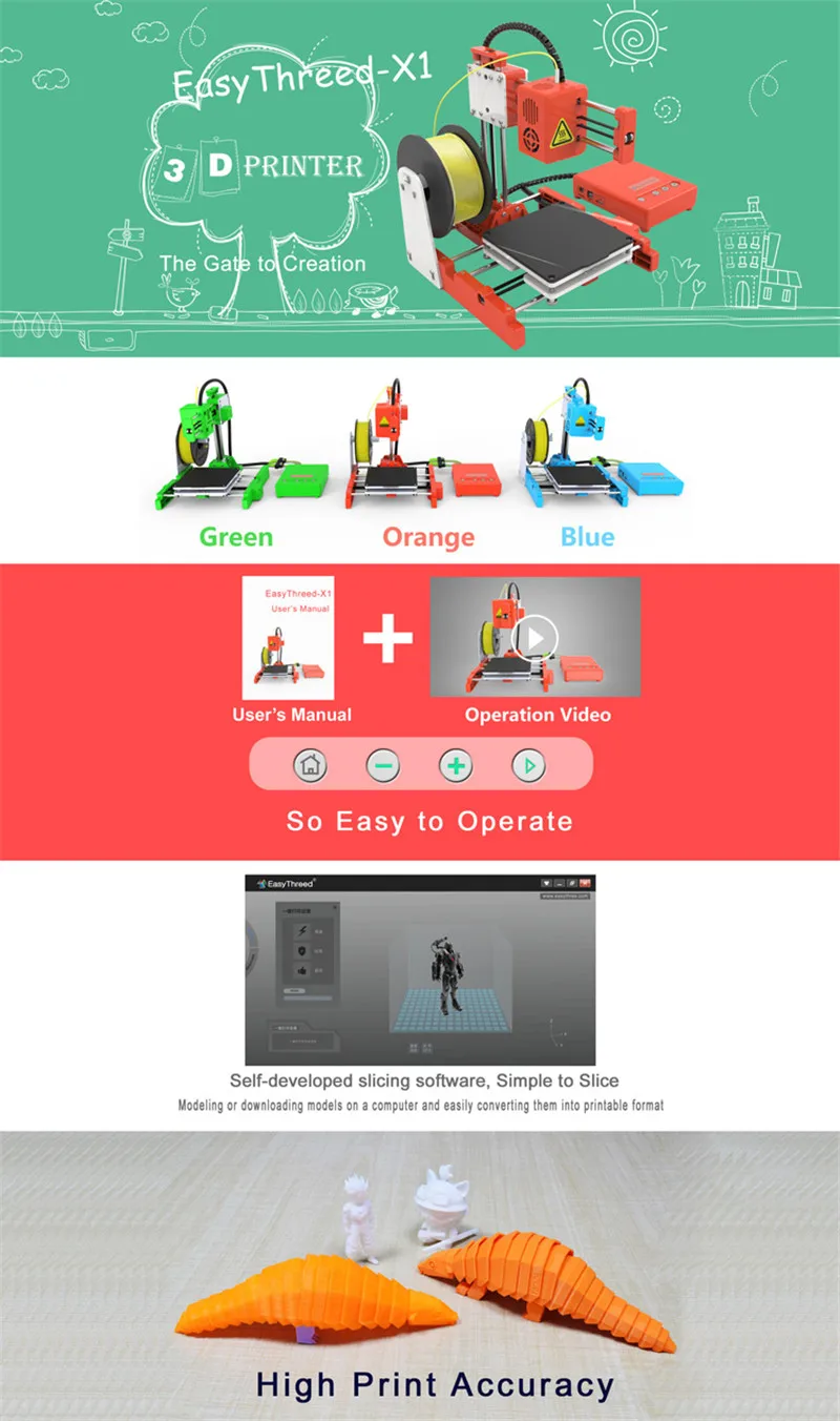 Описание:3D принтер Easythreed X1-это 3D принтер потребительского класса. Он поставляется с собственным программным обеспечением для нарезки (Easyware), которое было специально изготовлено и имеет уникальную функцию автоматического нарезки, основанную на ваших предпочтениях времени и качества. Операционное видео: https://www.youtube.com/watch?v=yYm1w7HcQhs&t=407s Примечание:* Источник питания: вилка стандарта ЕС (по умолчанию) Особенности:-Очень светильник, носить и ходить. Очень тихий. Сертификат: CE,FCC,RoHs-Печать одной кнопкой, аккуратно нажмите кнопку печати после вставки tf-карты, печать автоматически после разогрева.-Супер Простота установки, простота в эксплуатации и удобство. Со съемной магнитной платформой, Испытайте новое удовольствие.-Подходит для домашнего образования или DIY любителей, а также подходит для студентов, детей.-Принтер Easythreed X1 предназначен для детей и семей, поэтому я печатаю только нить PLA safefy .. Спецификация продукта:Название модели: X1Бренд: EasythreedТехнология печати: FDMАвтоматическое выравнивание кровати: нетРазмер здания: 100x100x100ммКоличество сопла: 1Сопло Диаметр: 0,4 ммТолщина слоя: 0,05-0,3 ммНить для печати: PLAДиаметр нити: 1,75 ммТочность печати: 0,1-0,2 ммГорячая кровать: нетПрограммное обеспечение для резки: Easyware, CURA,Simplify3DТемпература экструдера: 180-230 ℃Скорость печати: 10-40 мм/сек.Формат Fila: Вход:.Stl/obj, выход:.gcodeМощность: 12 В, 30 ВтРазмер машины: 205*210*245 ммРазмер подарочной коробки: 140*260*260 ммМашина Вес брутто: 2,0 кгВес нетто: 1,3 кгСтроительная Платформа: съемнаяПоддержка ОС: Windows XP/7/8/10 (32 бит/64 бит)Подключение к печати: tf-карта, usb-кабель,Промышленные Сертификаты: CE, FCC, RoHS Посылка включает в себя:1 x 3D принтер X11 х Кабель питания1 х USB кабель1 x tf-картаКард-ридер-1 шт.1 x Руководство пользователя1 крестовая отвертка1x10 м PLA 1,75 нити (случайный цвет)1 x набор держателей нитиВ комплекте: аксессуары для программного обеспечения внутри tf-карты Модель: X1