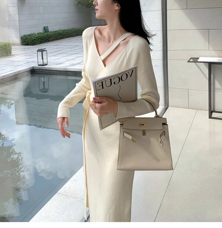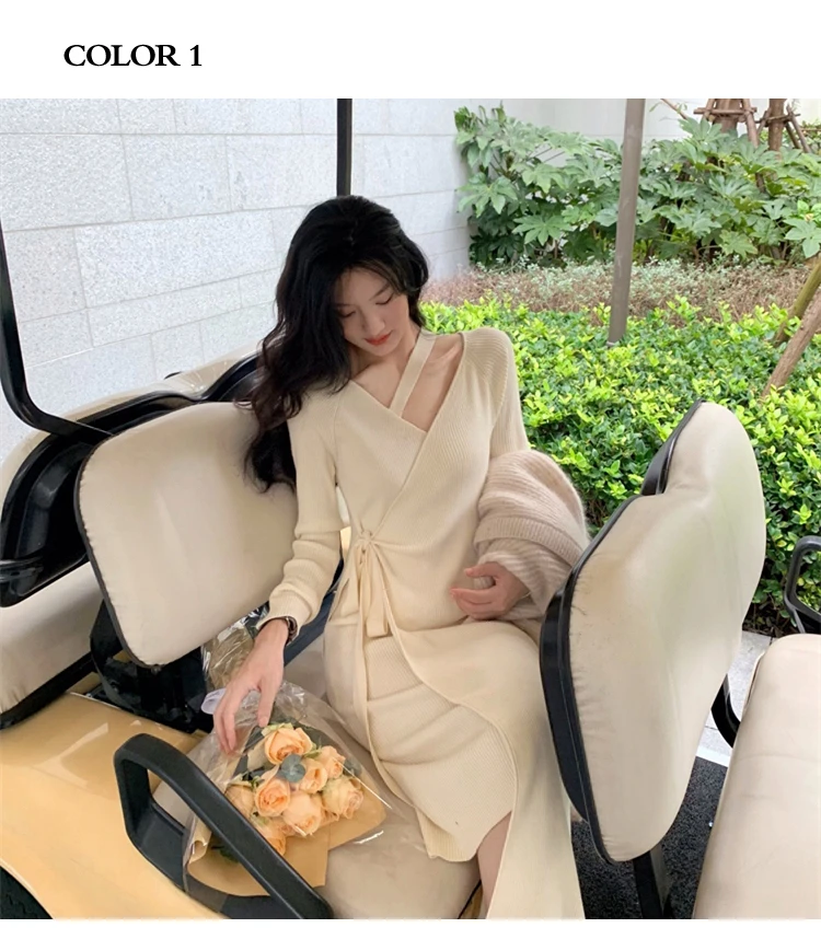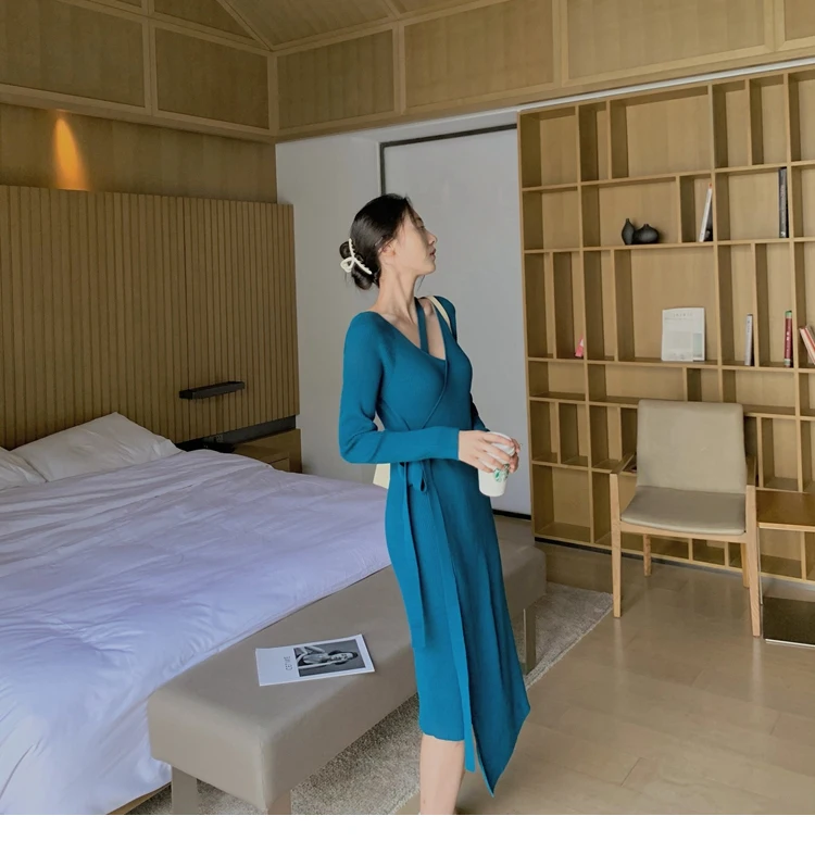Женское трикотажное платье во французском стиле, Элегантное Длинное облегающее пикантное платье с V-образным вырезом, винтажная одежда с длинным рукавом, 1061 #, Осень-зима