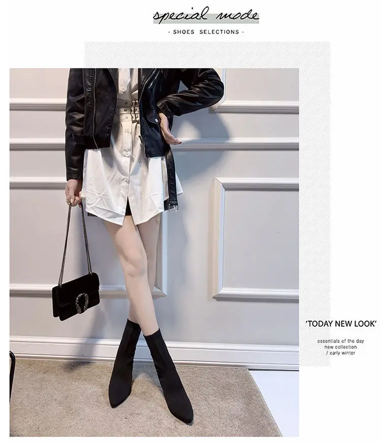 Пикантные женские тонкие ботинки с острым носком, женские осенние вязаные эластичные ботильоны на шпильке, черные универсальные эластичные ботинки на высоком каблуке