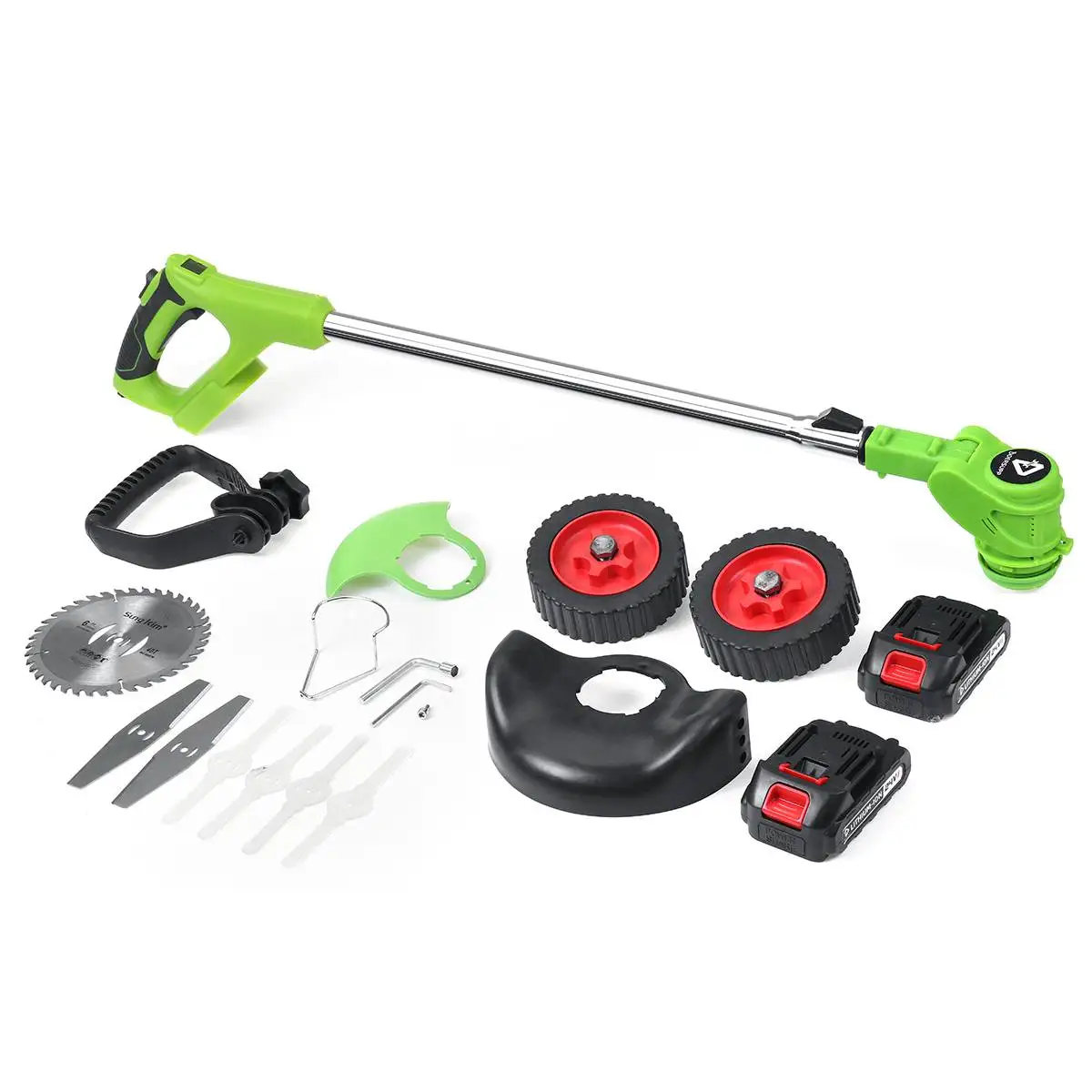Особенности:-Двигатель из чистой меди, высокая мощность, быстрая скорость.-Провод для предотвращения столкновений, лезвие защитной рамы никогда не прикасается к твердым предметам.-Регулируемая головка машины, без мертвого угла.-Водонепроницаемый Чехол, не легко просачиваться в дождь или розу во время использования.-Диаметр резки, диаметр резки до 150 мм, высокая эффективность.-Удобная вспомогательная ручка, удобная ручка, без ручного трения, положение можно регулировать по желанию.-Двойное переднее колесо, более удобное для работы в течение длительного времени.-Двойная ручка переключателя управления, более удобная работа, высокий коэффициент безопасности.-Светодиодный дисплей батареи, легко понять оставшуюся емкость аккумулятора и контролировать нагрузку.-16-раздел полюс может быть отрегулировано по своему желанию, со степенью расширения 1-36 см, а высота может быть отрегулировано по своему желанию в соответствии с потребностями.
