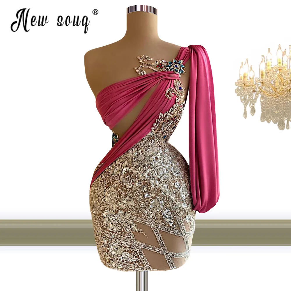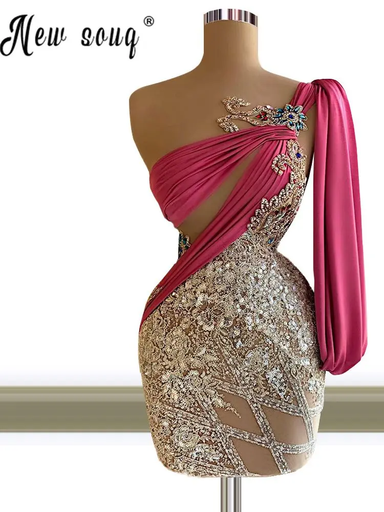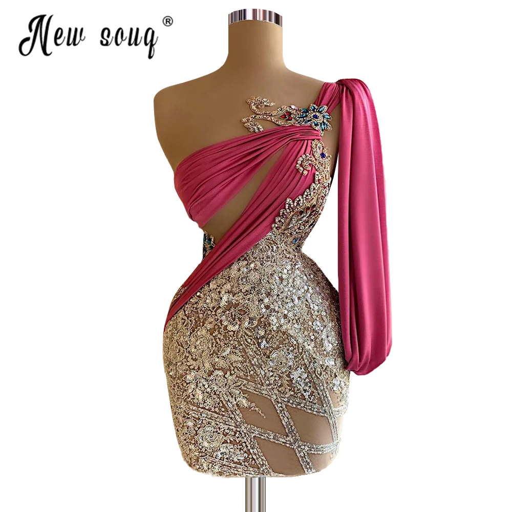 Мини коктейльные платья с блестящими бусинами Дубая 2021 сексуальное Плиссированное золотистое и розовое вечернее платье-Русалка на одно плечо