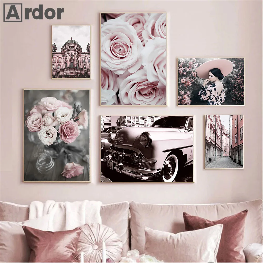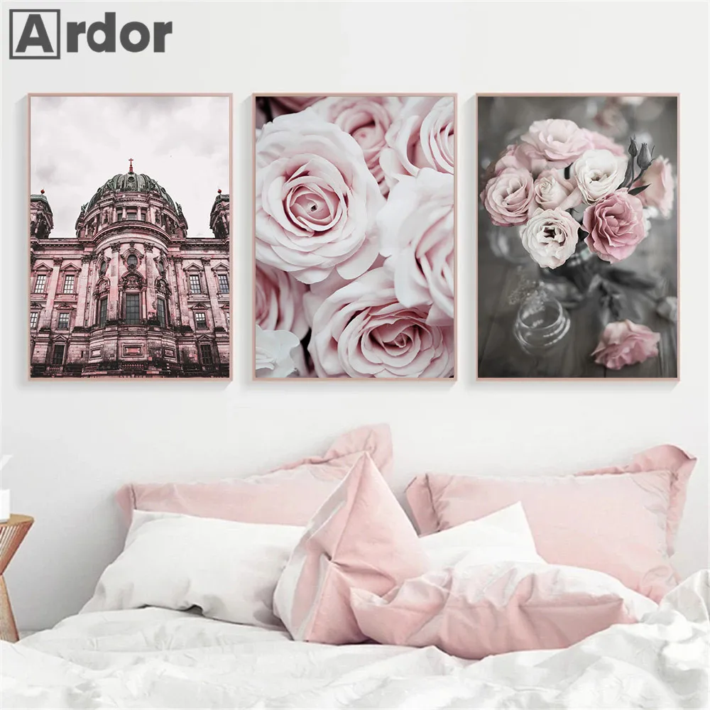 Настенный постер с изображением розовых роз, Картина на холсте, уличное здание, Современные художественные постеры для автомобиля, декор для гостиной в скандинавском стиле