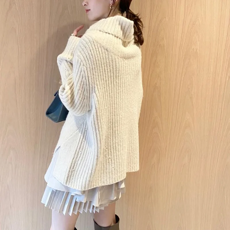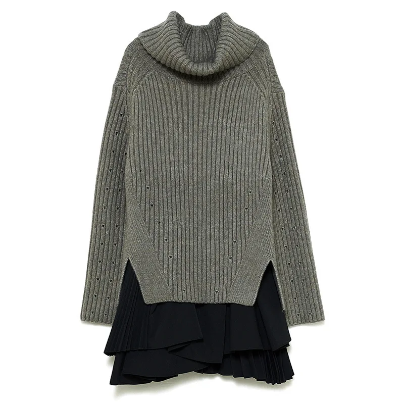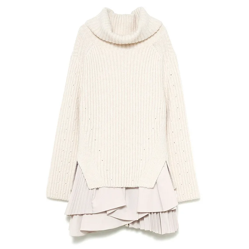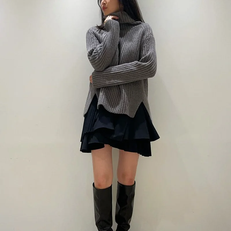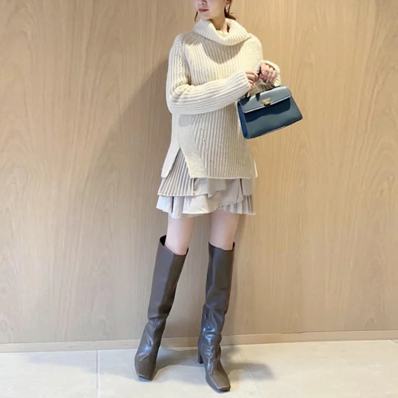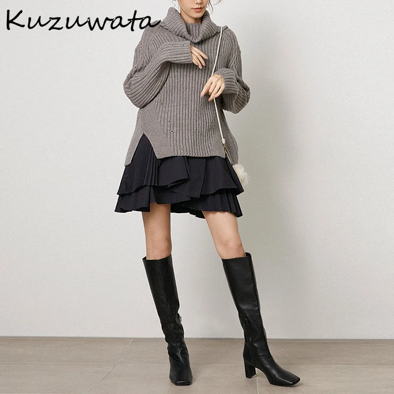 Новинка 2022, осенняя женская одежда Kuzuwata, вязаный свитер с высоким воротником и длинным рукавом, с Боковым Разрезом, топы, плиссированные платья на бретелях с оборками