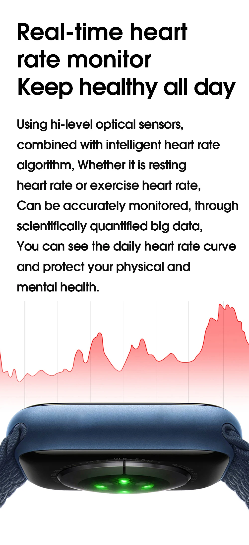 С помощью высокоуровневых оптических датчиков, в сочетании с интеллектуальным алгоритмом сердечного ритма, будь то пульс в состоянии покоя или пульс. Можно точно контролировать, с помощью научно определенных больших данных, вы можете увидеть ежедневную кривую сердечного ритма и защитить свое физическое и умственное здоровье.