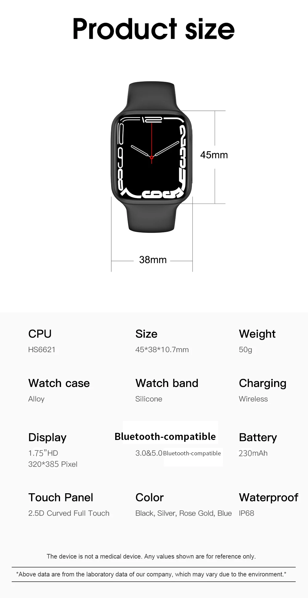 1. Модель: W27 Pro2. Размеры: 45*38*10,7 мм3. Материал корпуса: цинковый сплав4. Материал ремешка: силикон5. Экран Размер: 1,75 дюймов6. Разрешение: 320*3857. Чип: Hs66218. RAM + ROM: 256кб + 8 Мб9. Bluetooth: 5,0 + 3,010. Емкость аккумулятора: 230 мАч11. Способ зарядки: Беспроводная зарядка12. Время зарядки: 150 минут13. Срок службы батареи: 2-10 дней14. Водонепроницаемость: IP68