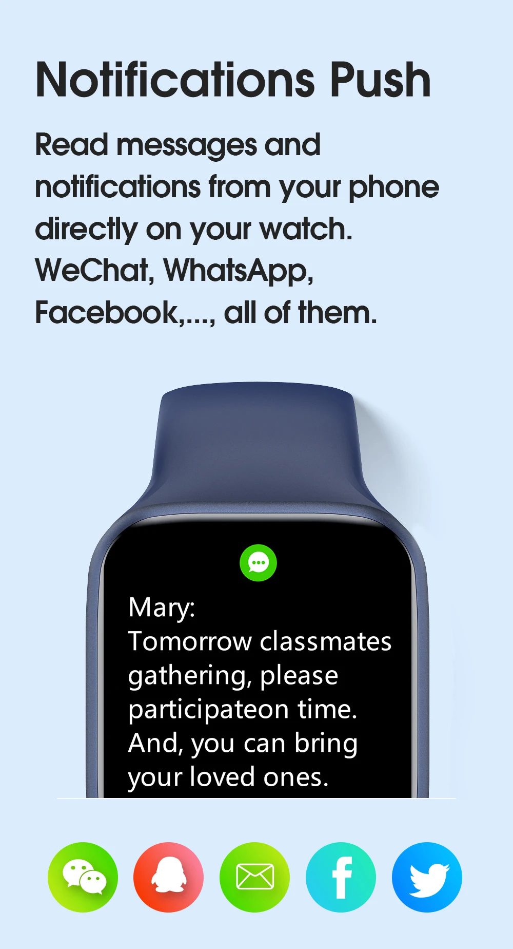 Прочитайте сообщения и уведомления с вашего телефона прямо на часах. Wechat,Whatsapp,Facebook... все из них.