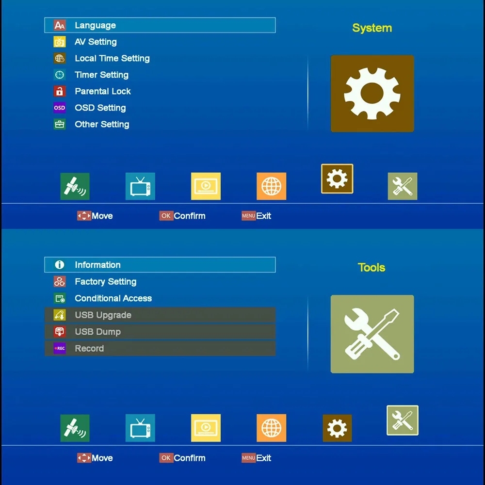 Выходной интерфейс: LNB IN * 1, HD OUT, RCA * 3, коаксиальный, ETHERNET, RS232, USB * 1, источник питания