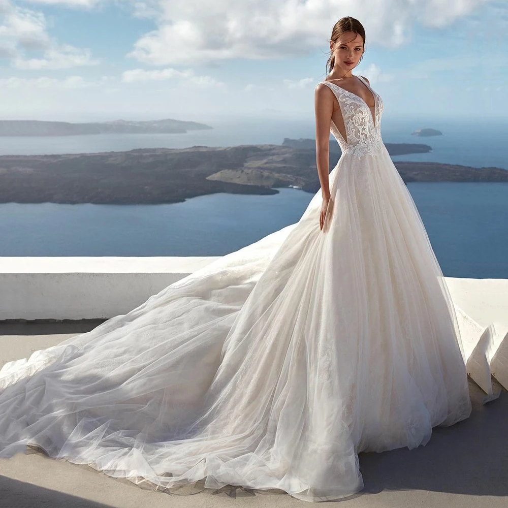 UZN Новое поступление цвета слоновой кости кружевное платье принцессы из тюля свадебное платье сексуальный глубокий v-образный Вырез свадебные платья с глубоким вырезом на спине Иллюзия Топ невесты платья