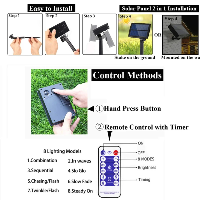 【 8 режимов освещения. Устойчивый или мерцающий. С пультом дистанционного управления таймером нажмите кнопку «режим» на задней панели солнечной панели или пульт дистанционного управления для цикла через 8 световых эффектов: Комбинация, в волнах, последовательных, Slo Glo, чеканка за вспышкой, медленное лицо, мерцание, постоянное включение. Для экономии энергии вы можете дистанционно управлять настройкой таймера 3/5/8 часов.