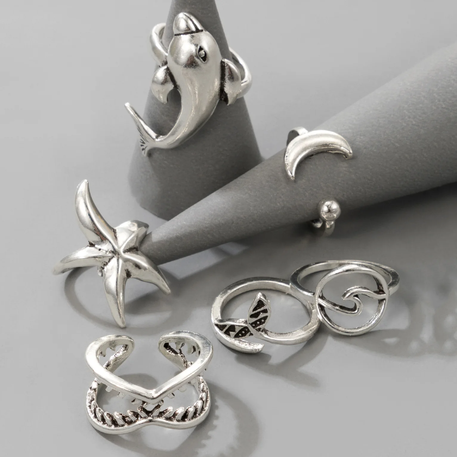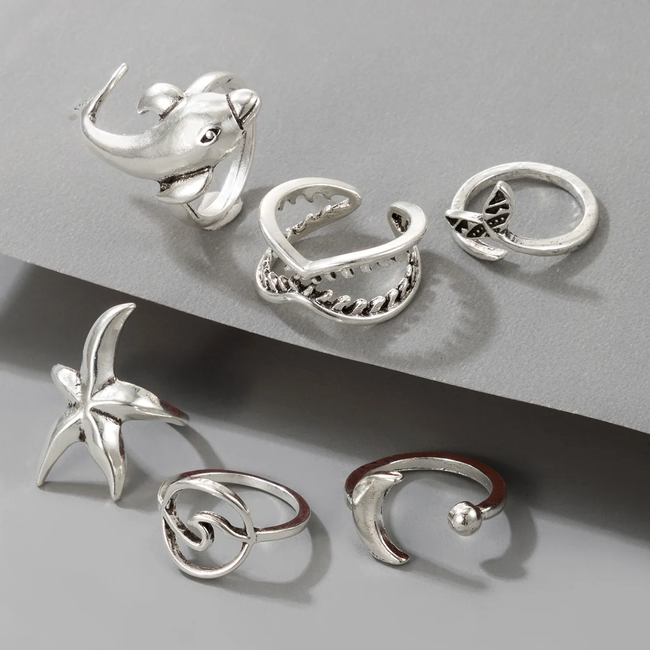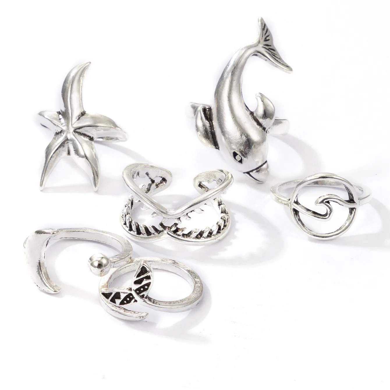 Кольцо кольцо для мужчин и женщин, ювелирное изделие в стиле бохо, 6 шт.компл., кольцо в виде рыбьего хвоста, Дельфина, морская звезда, луна, серебристого цвета