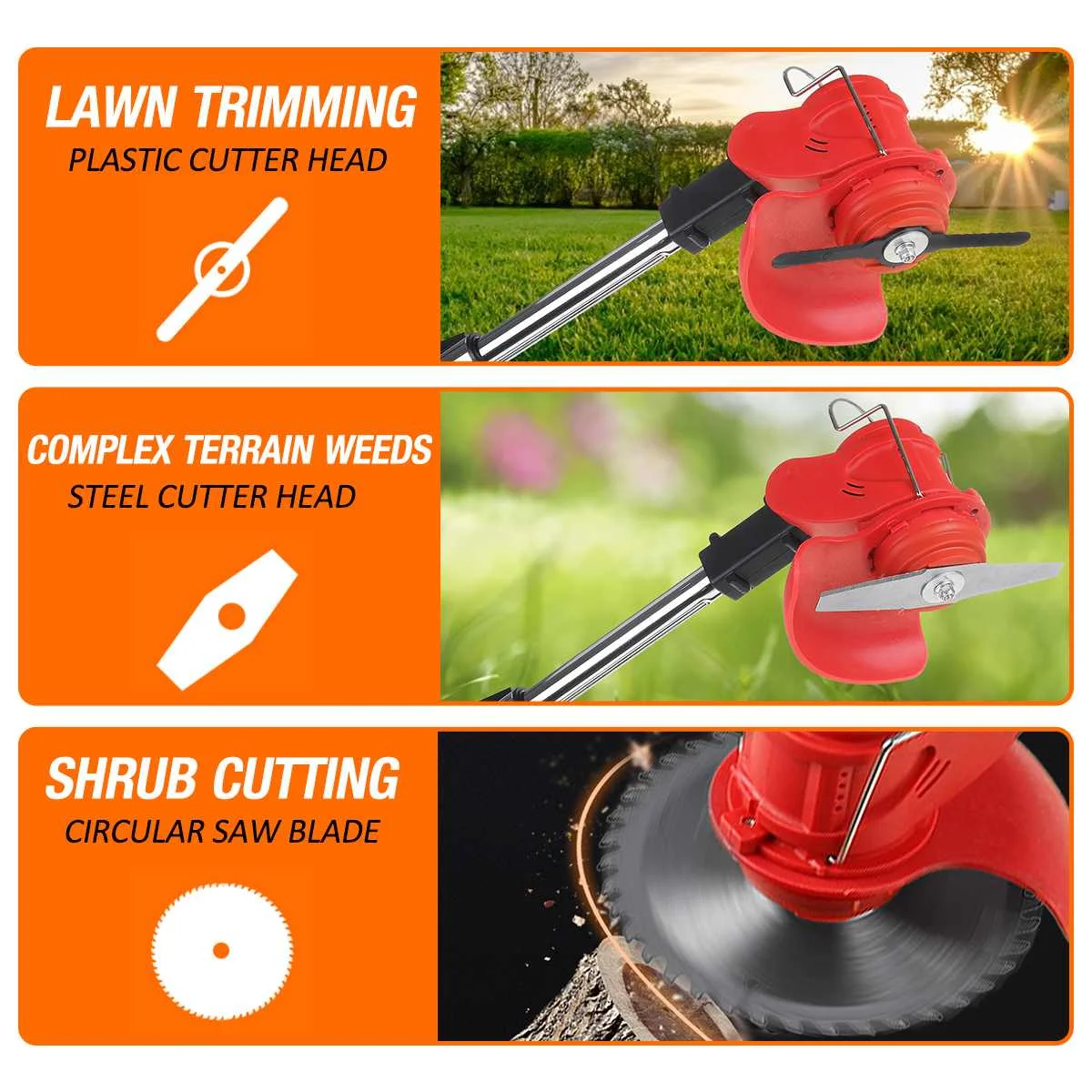 Особенности:-Двигатель из чистой меди, высокая мощность, быстрая скорость.-Провод для предотвращения столкновений, лезвие защитной рамы никогда не прикасается к твердым предметам.-Регулируемая головка машины, без мертвого угла.-Водонепроницаемый Чехол, не легко просачиваться в дождь или розу во время использования.-Диаметр резки, диаметр резки до 150 мм, высокая эффективность.-Удобная вспомогательная ручка, удобная ручка, без ручного трения, положение можно регулировать по желанию.-Двойное переднее колесо, более удобное для работы в течение длительного времени.-Двойная ручка переключателя управления, более удобная работа, высокий коэффициент безопасности.-Светодиодный дисплей батареи, легко понять оставшуюся емкость аккумулятора и контролировать нагрузку.-16-раздел полюс может быть отрегулировано по своему желанию, со степенью расширения 1-36 см, а высота может быть отрегулировано по своему желанию в соответствии с потребностями.
