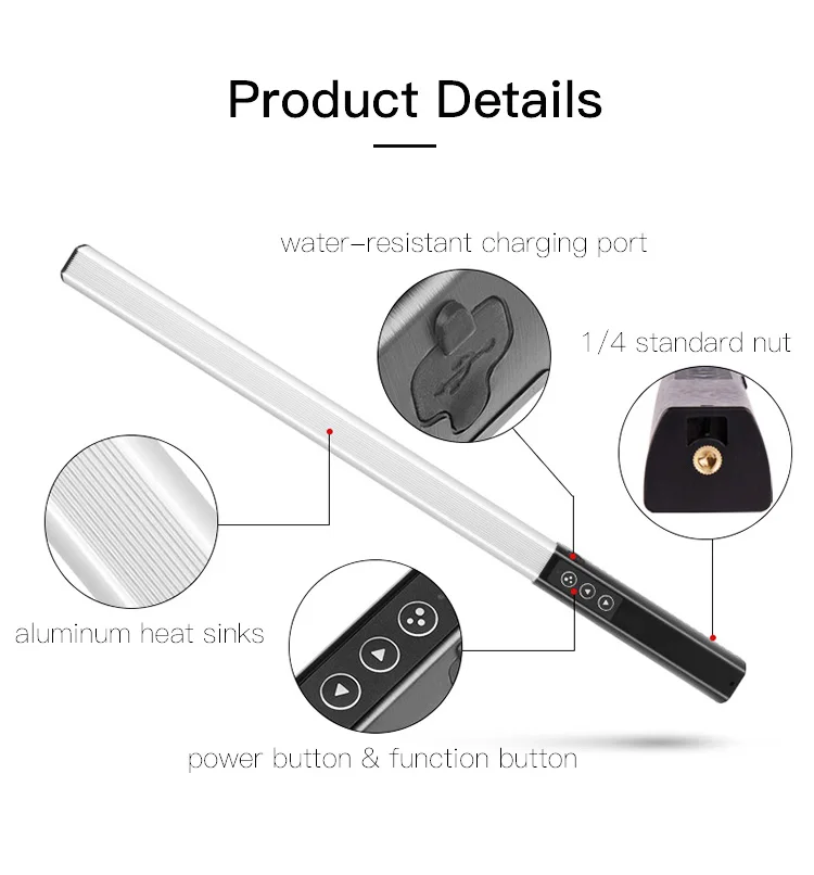 Спецификация:Модель: Q508A Размер: 550x35x29 мм Мощность: 10W9 (макс.) Цвет Температура: 3000k/ 5700k Яркость: 1000lux/0,5 м Вход: 5V/2A Время зарядки: 3-4 часа Батарея: 7,4 V/ 2600 мА/ч, Вес: 340g порт зарядки: Micro USB посылка: 1 x RGB цветной ручной светодиодный светильник
