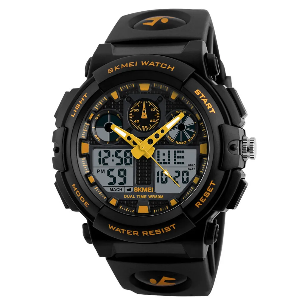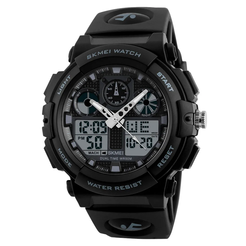 Уличный Многофункциональные спортивные часы, 50 м водонепроницаемые цифровые часыВыбор материала: пластиковый ремешок, высококачественное пластиковое зеркало, нижняя крышка из нержавеющей стали, Пряжка из нержавеющей стали