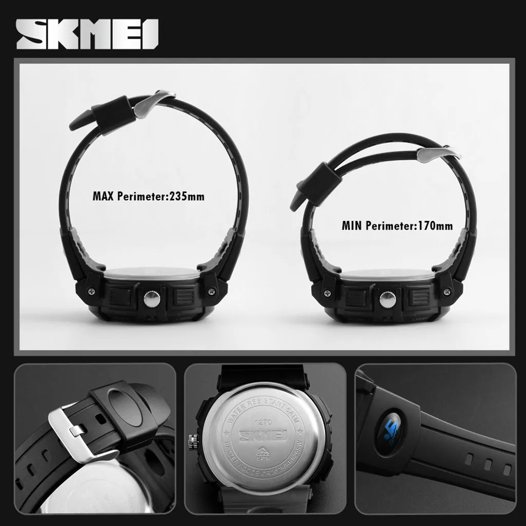 -Тип дисплея: ЖК-дисплей и аналоговый Корпус часов Диаметр: 5,0 см (2,0 ") Корпус часов Толщина: 1,7 см (0,7 ") -Диапазон Длина (в комплекте чехол): 25,0 см (9,8 ") Ремешок для часов Ширина: 3,0 см (1,2 ") Материал ремешка: Резина Чехол Материал: Пластик