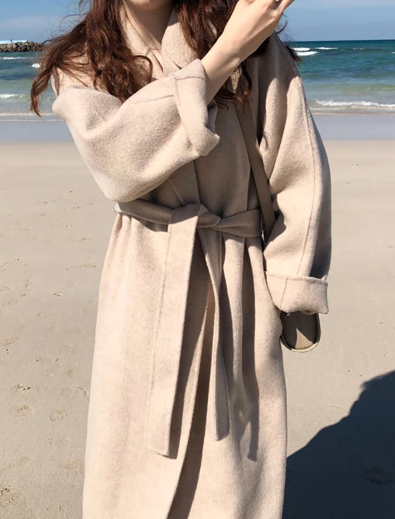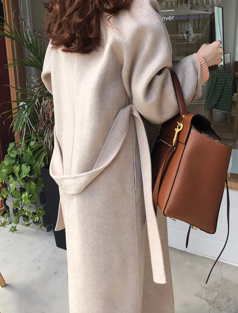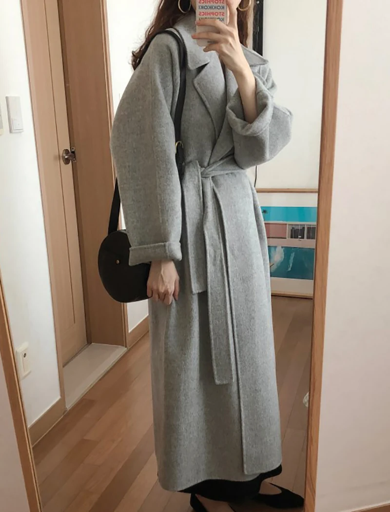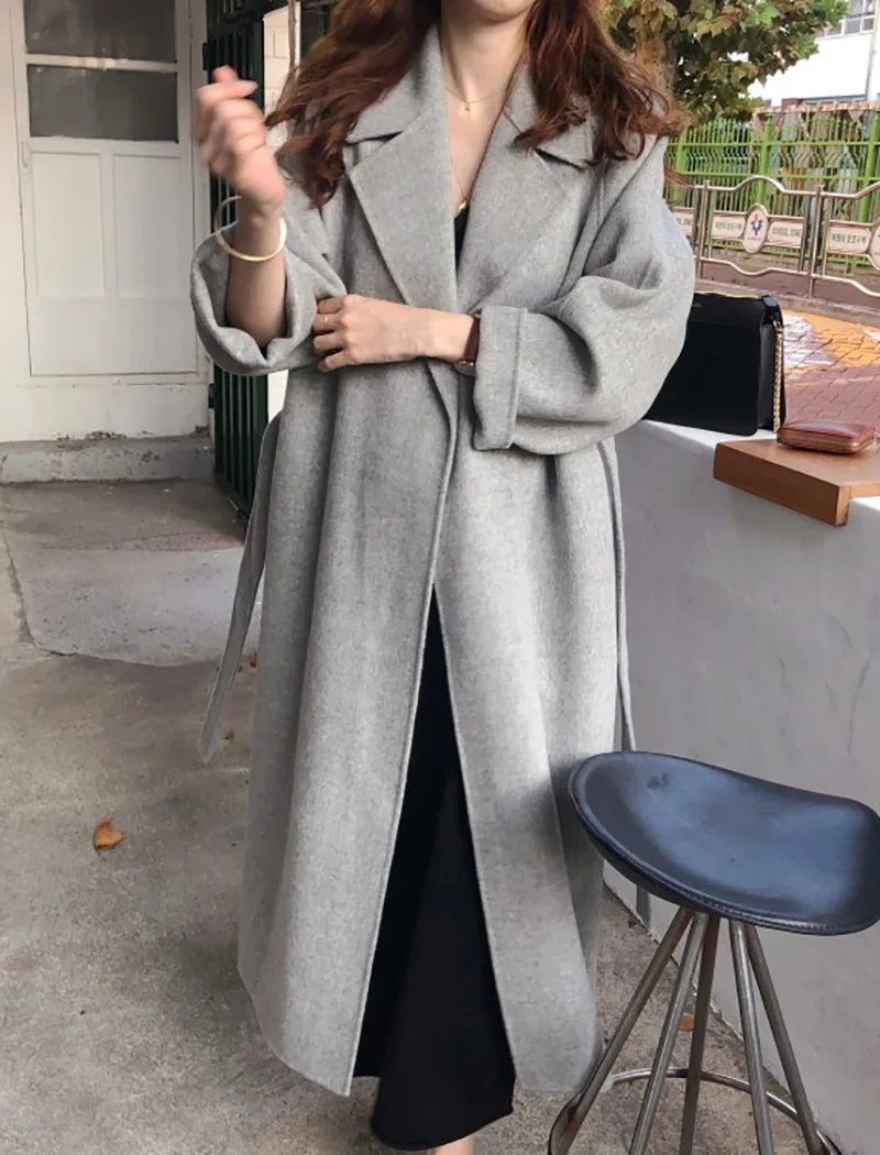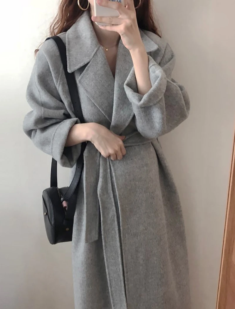 Женское шерстяное пальто с поясом, длинным рукавом и отложным воротником