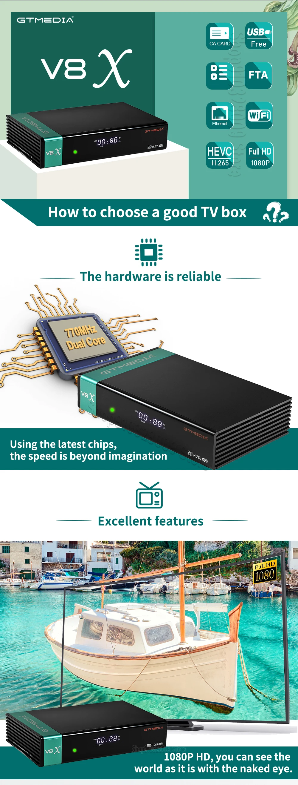 * V8X поддерживает новейшую систему H.265 HEVC main 10 в Италии, и просмотр в режиме реального времени будет более плавным. Он оснащен слотом для карт CA, который поддерживает большинство смарт-карт, разрешение видео 1080P и английский, испанский, португальский, русский и другие 24 языка. И вы можете избавиться от дорогих машин от поставщиков карт.