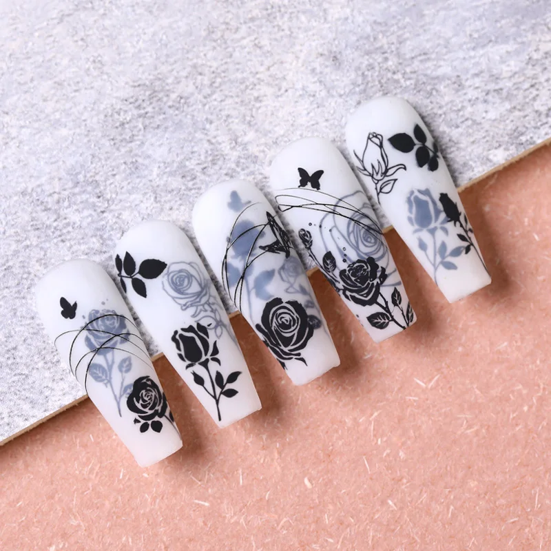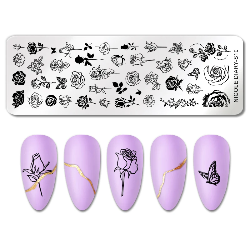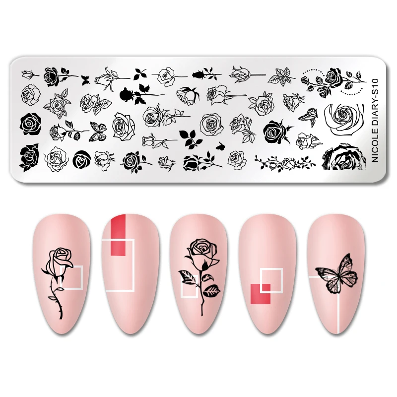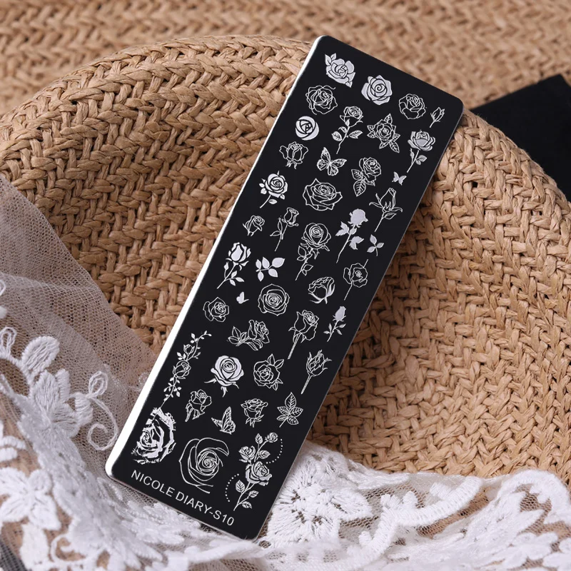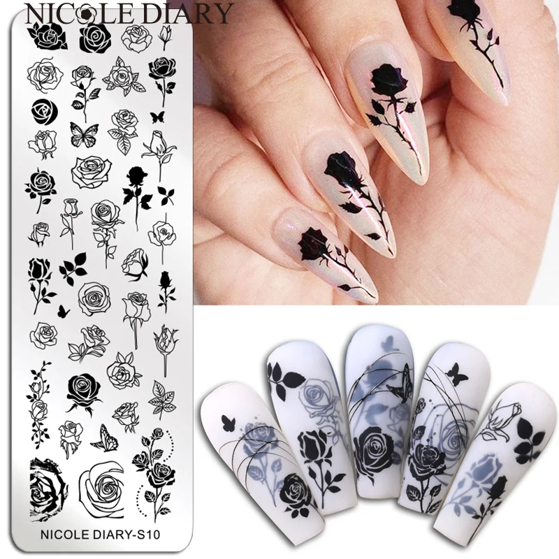 Трафареты NICOLE DIARY для маникюра, штамповочные пластины для ногтей с изображением роз, черного и белого цветов