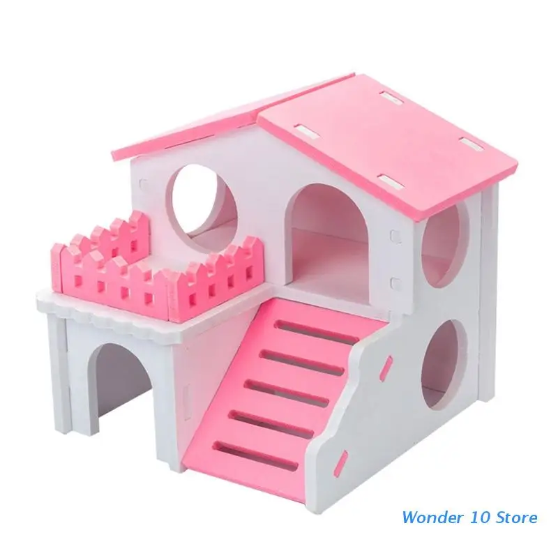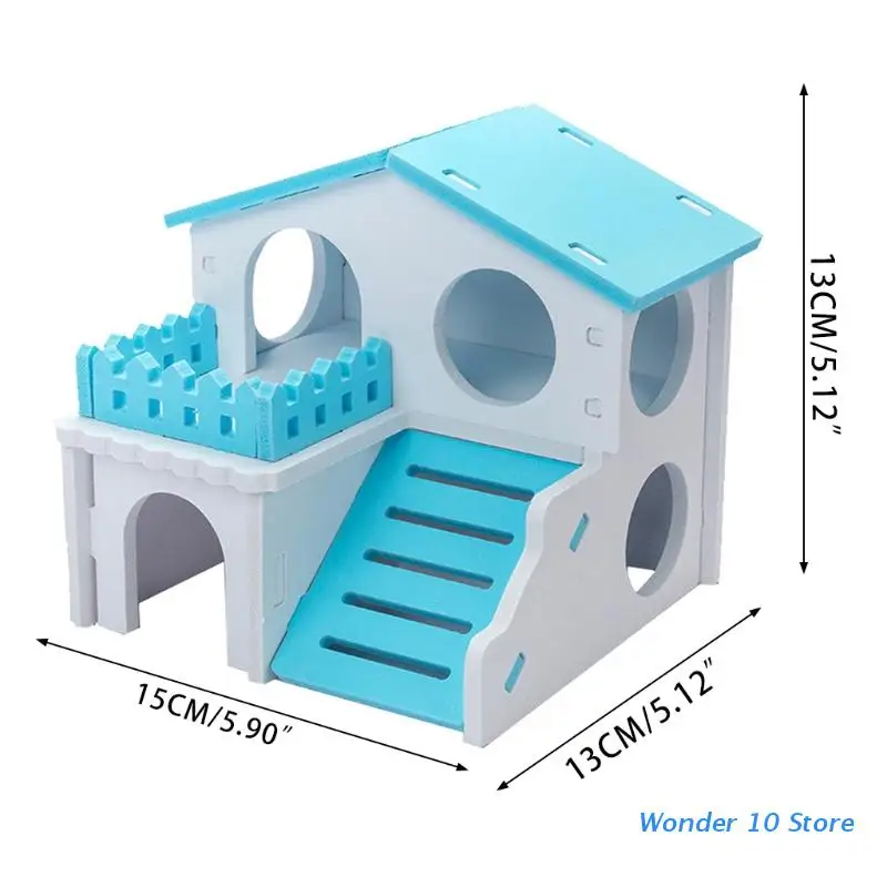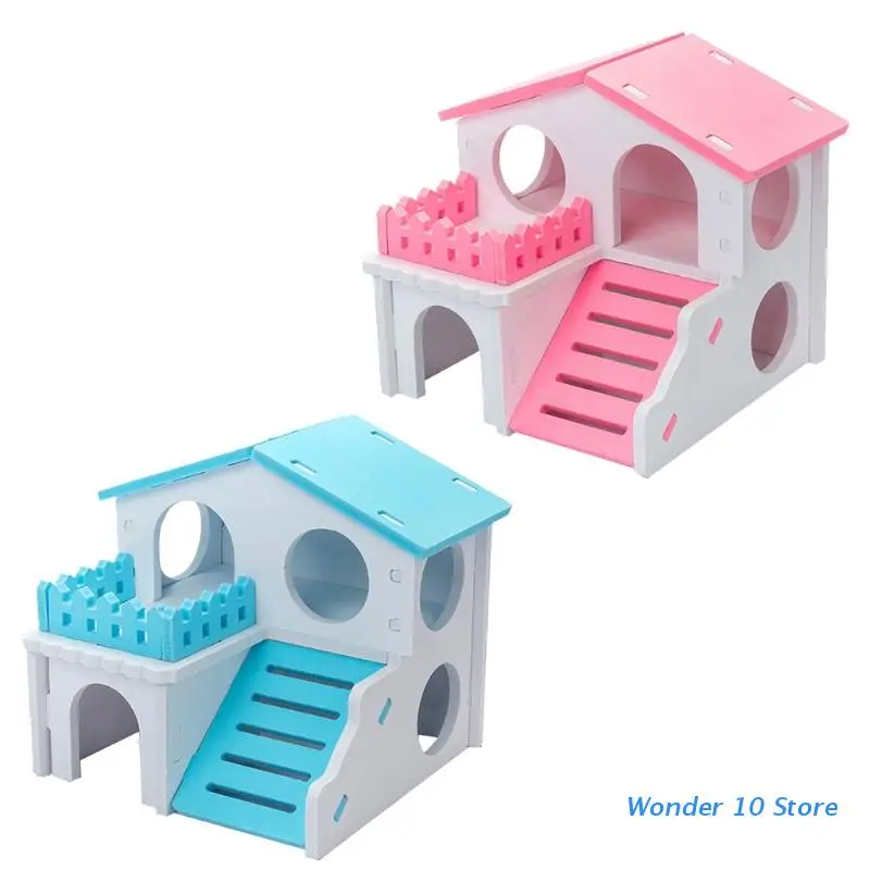 Деревянный домик для хомяка, 2-этажная вилла, маленькие питомцы, игрушка для скалолазания, укрытие для карликового хомяка, аксессуары для клетки, синийрозовый