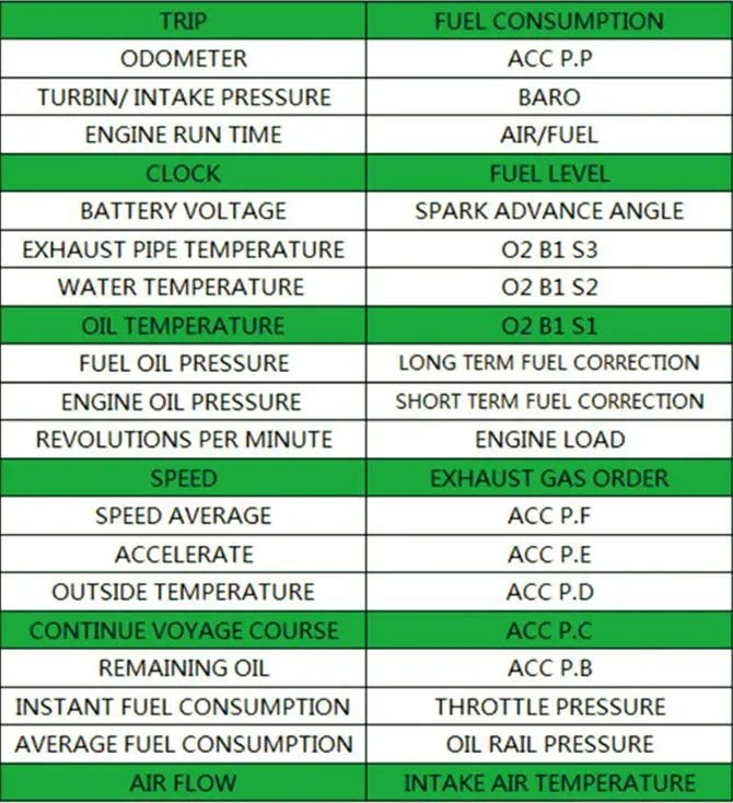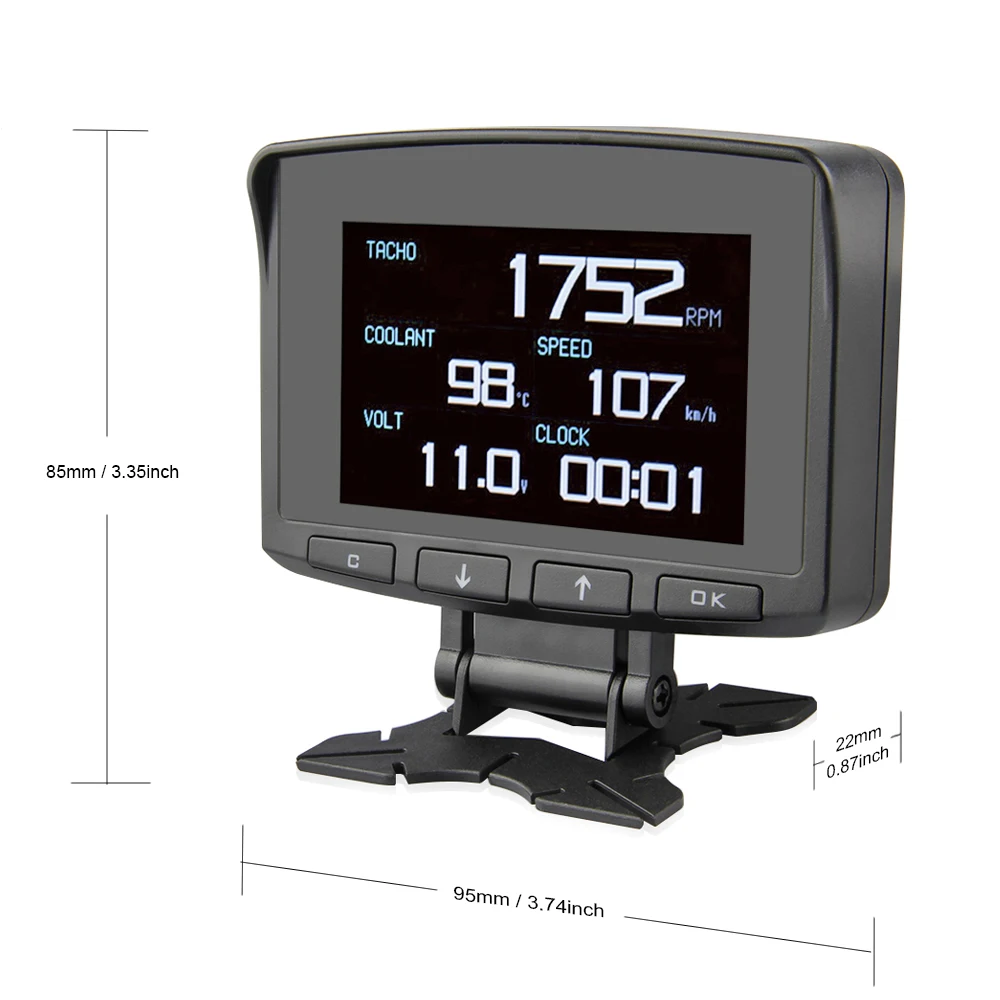 Понижение температуры воды, оповещение о превышении скорости, напоминание о смене, предупреждение о температуре двигателя;Ликвидация кода неисправности: отсканируйте обычные коды неисправностей транспортного средства и Уменьшите затраты на техническое обслуживание;Измеритель расхода топлива;Монитор и дисплей напряжения батареи