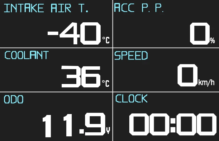 1. Спидометр,2. Тахометр,3. Текущий пробег,4. Общий пробег,5. Датчик температуры воды,6. Датчик температуры масла, измеритель расхода топливаМгновенный расход топлива, средний расход топлива, почасовой расход топлива7. Датчик давления на входе турбины,8. Угол зажигания,9. Отверстие дроссельной заслонки,10. Электронные часы11. Напряжение батареи,12. Напряжение зарядки двигателя