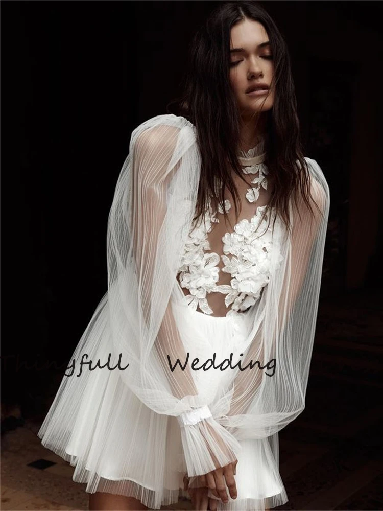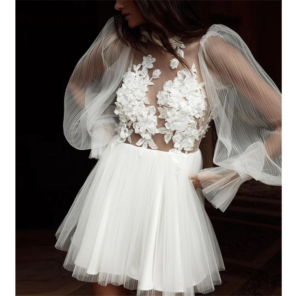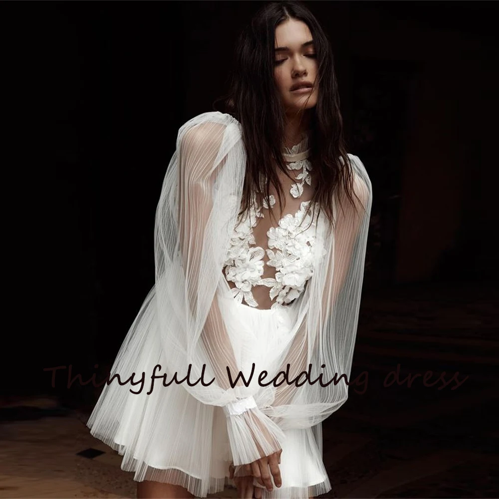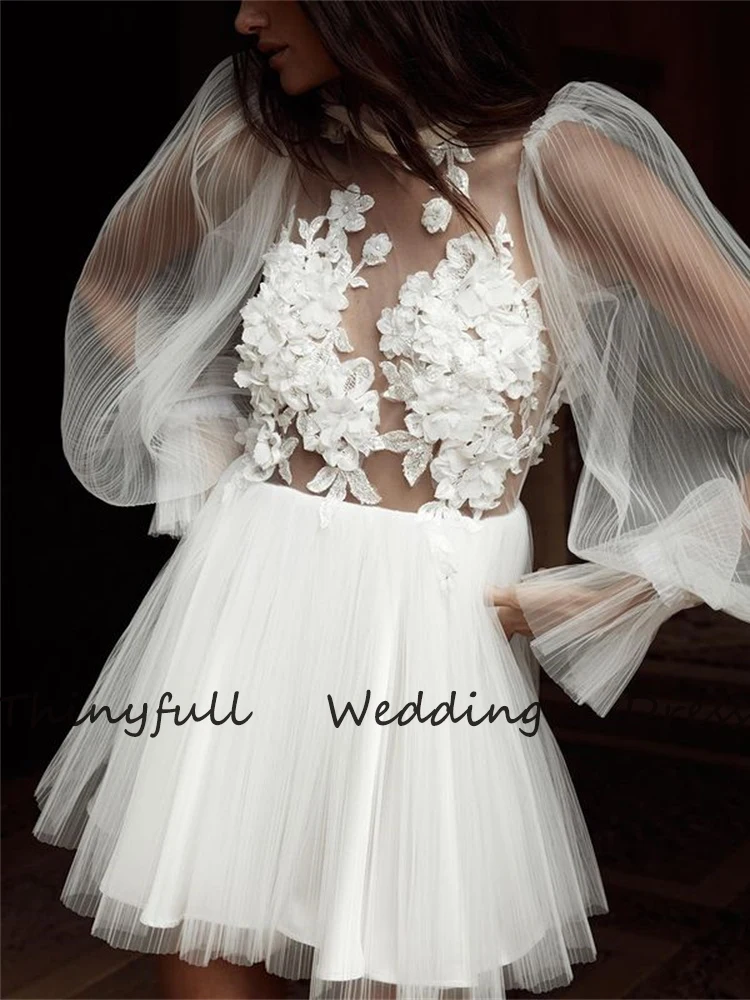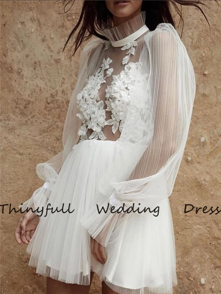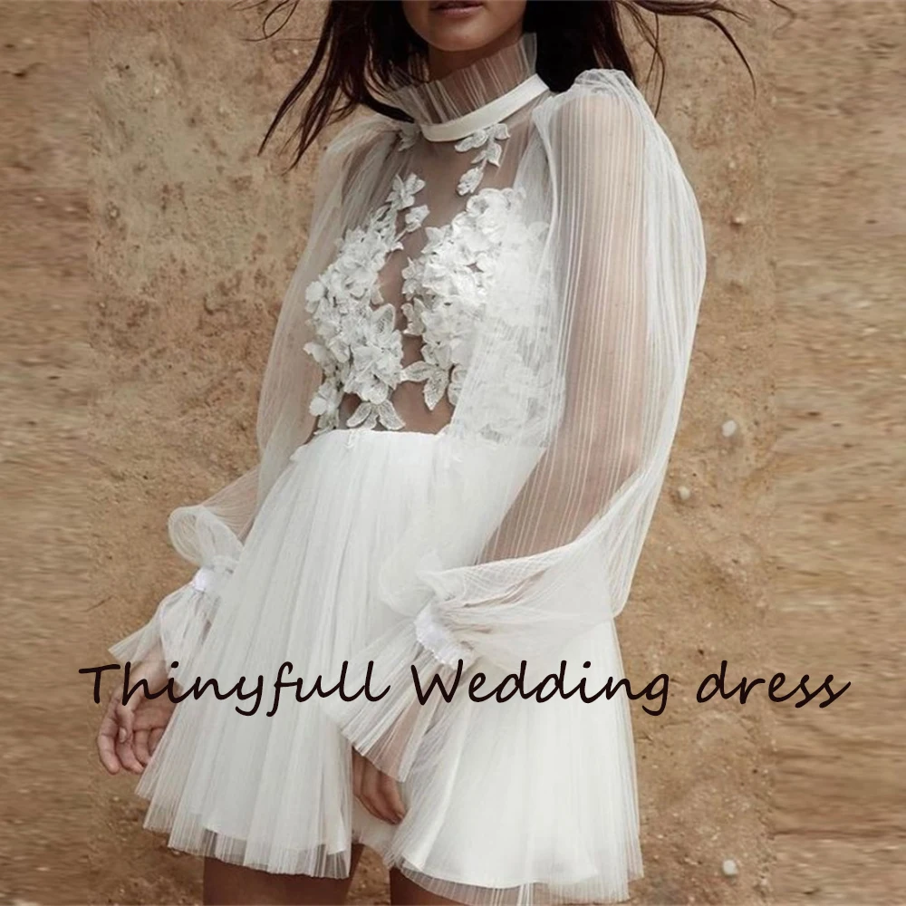 Женское мини-платье с цветочным принтом Thinyfull, короткое пляжное свадебное платье с пышными рукавами и высоким воротом, свадебное платье в стиле кантри, богемное платье невесты, свадебные платья