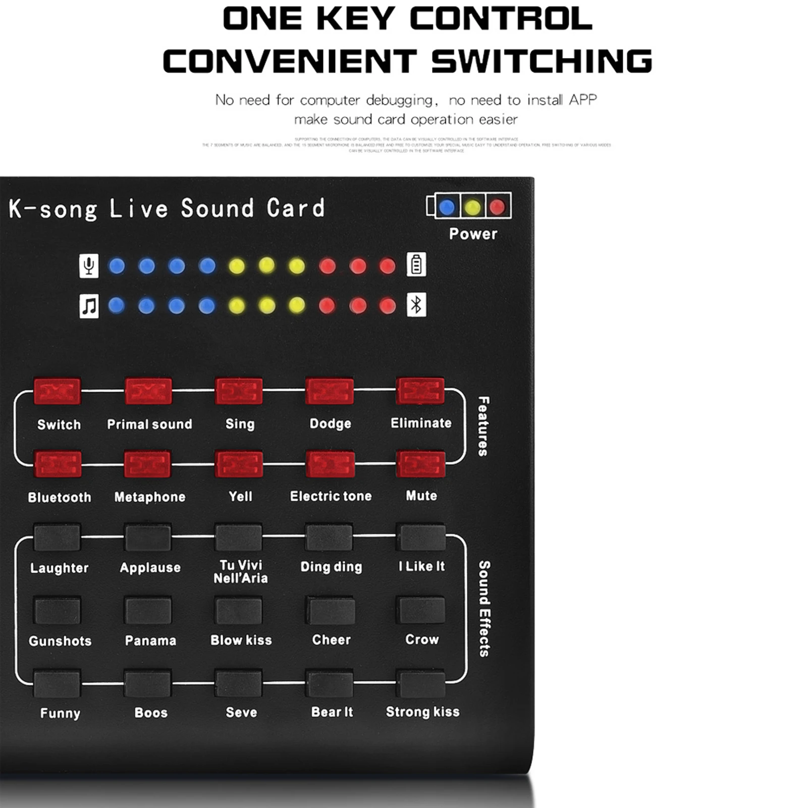 Поставляется с звуковыми эффектами прямого вещания, импортом фонового сопровождения, одним нажатием прямой трансляции, чтобы помочь вам легко создать атмосферу прямого вещания.Особенности:Многофункциональная звуковая карта, 15 звуков спецэффектов, 4 вида голосовых изменений.Регулируемый звуковой вход и выход, регулировка баланса, точный звуковой эффектВстроенная функция BT, беспроводное соединение BT, стабильное соединение, четкое качество звука, без задержек.Чип DSP интеллектуальное шумоподавление, может изменить звукСпециальный интерфейс для звуковой карты, подходит для микрофонов с маленькими и средними диафрагмами на рынкеМожно подключить зарядный кабель к компьютеру.Характеристики:Материал: металлический матовый корпусЧип: двойной чип шумоподавления DSPИнтерфейс: USBБатарея: 3,7 V 1000mahРазмер изделия: 183*120*28 мм/7,2*4,7 * 1.1inВес изделия: 550 г/1,2 фунтаРазмер посылка: 217*170*48 мм/8,5*6,7*1,9 дюймовПосылка Вес: 700 г/1.7lbУпаковочный лист:1 * звуковая карта R8 Voice Changer1 * USB кабель для зарядки2 * аудио кабель