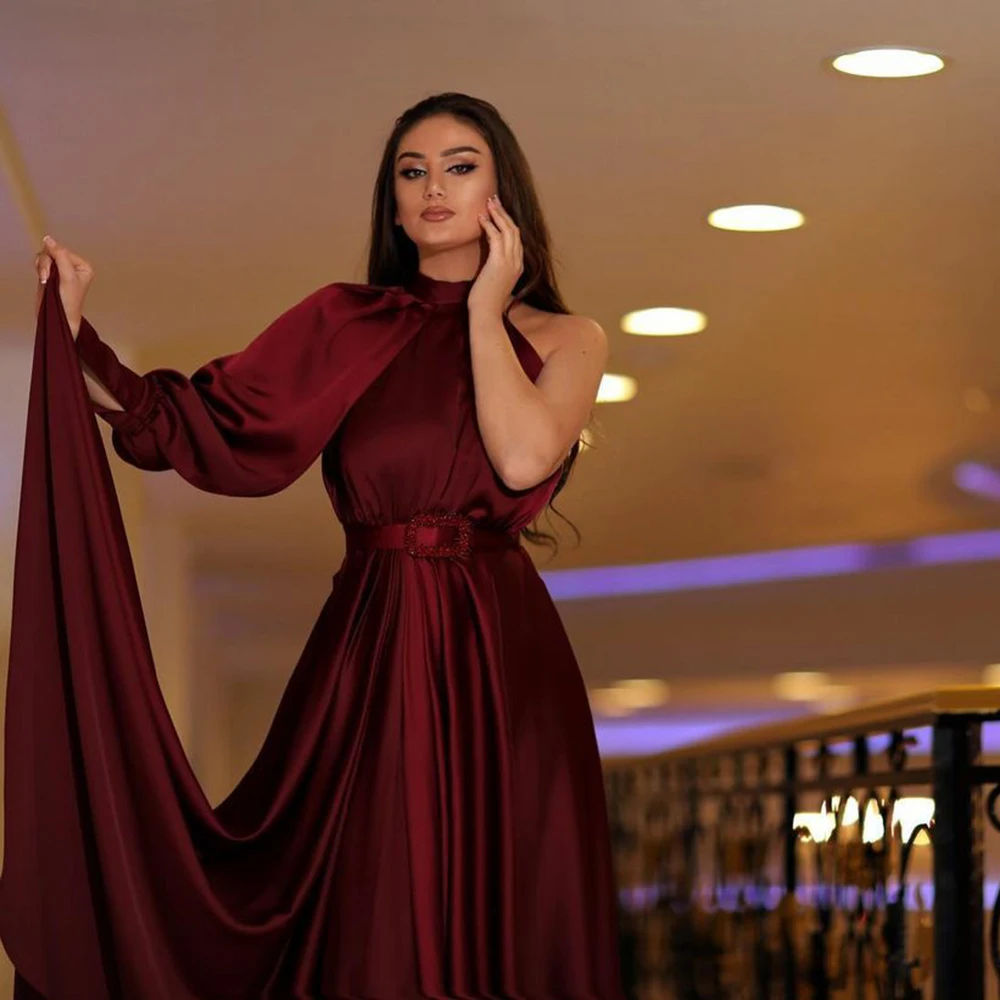 Платье-трапеция из шелка и сатина, бордового цвета, на одно плечо, с пышным рукавом, на молнии сзади, Сексуальные вечерние платья