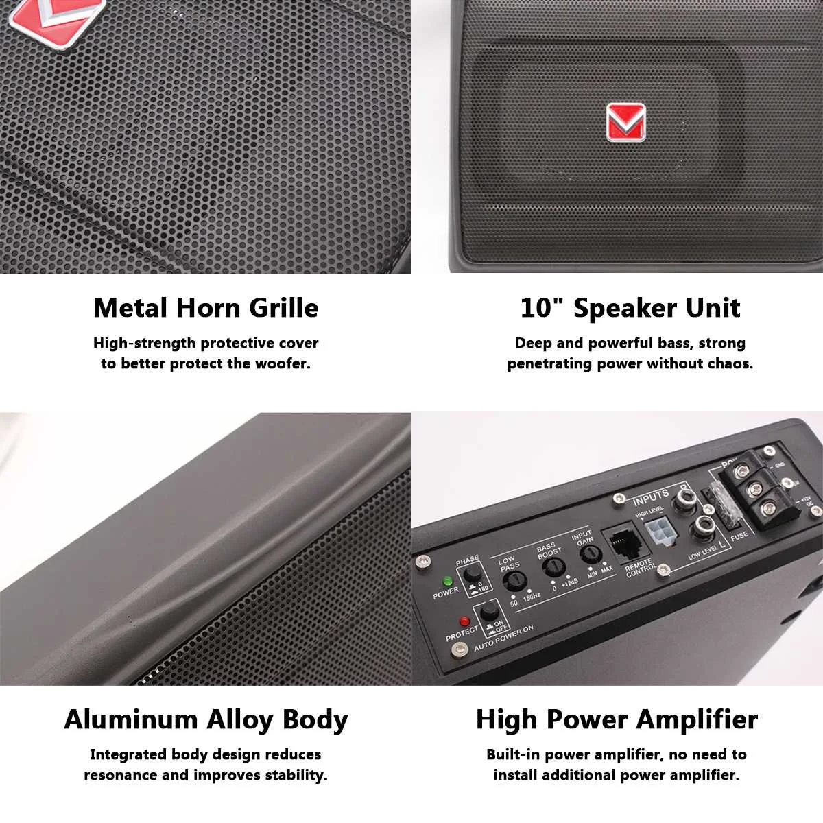 Особенности:-10-дюймовая шпилька ультра-тонкий автомобильный сабвуфер с усилителем, полнофункциональный и простой в отладке.-3D объемный, мощный бас, захватывающий музыкальный опыт.-Изготовлен из алюминиевого сплава, коробка может уменьшить резонанс и улучшить стабильность вождения.-Металлическая защитная сетка может эффективно рассеивать тепло и защищать внутренний динамик с высокой прочностью.-Компактный размер, ультратонкий дизайн, может быть установлен непосредственно под сиденьем.