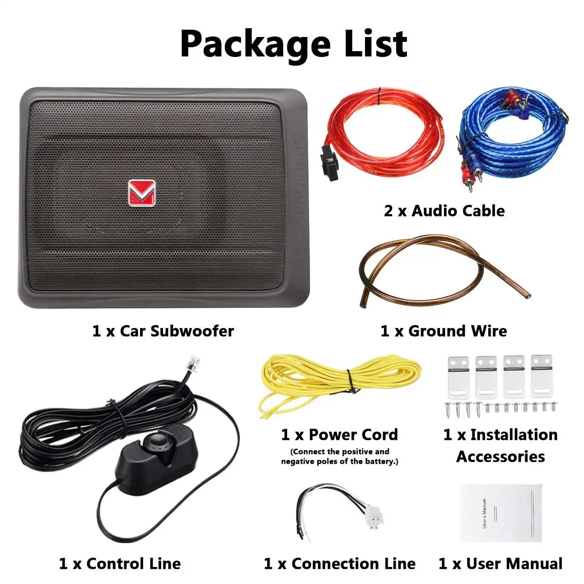 Посылка включает в себя:Автомобильный сабвуфер-1 шт.1 х шнур питания (используется для подключения положительного полюса)1 x соединительная линия1 x заземляющий провод1 х линия управленияАудиокабель-2 шт.1 комплект монтажных аксессуаров1 x Руководство пользователяСоветы:При подключении источника питания сначала подключите аудиокабель, затем подключите блок питания (-), а затем подключите блок питания (+) и, наконец, подключите к линии управления. Вы должны использовать квалифицированный шнур питания (2,5 ㎡) и предохранитель (20A) линия управления может использовать тонкие линии (0,1 ㎡)