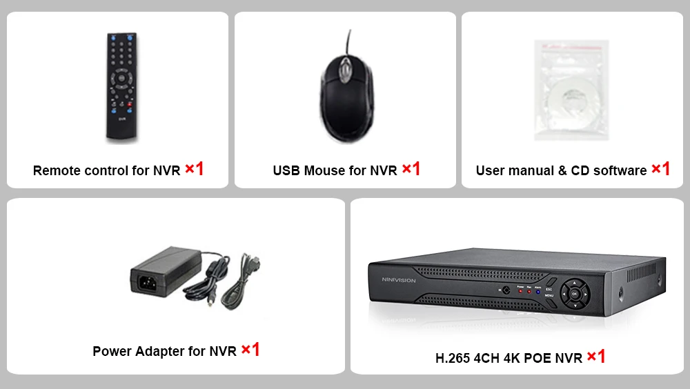 1 сетевой видеорегистратор 4CH 4K POE NVR;1 x Блок питания для NVR;1 х USB мышь для NVR;1 компакт-диск программного обеспечения для NVR;1 пульт дистанционного управления для NVR;