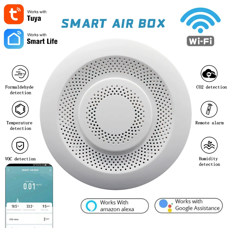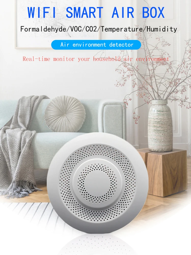 Умная воздушная коробка является домом для интеллектуального устройства для удаленного мониторинга воздушной среды, она также может обнаруживать формальдегид, ЛОС ядовитого газа, CO2, температуру, влажность и так далее 5 видов экологических параметров, экологические параметры автоматически превышают цену, когда граффити умный дом кондиционер воздуха, новый вентилятор, увлажнитель воздуха, Очиститель воздуха для оптимизации бытовой среды.