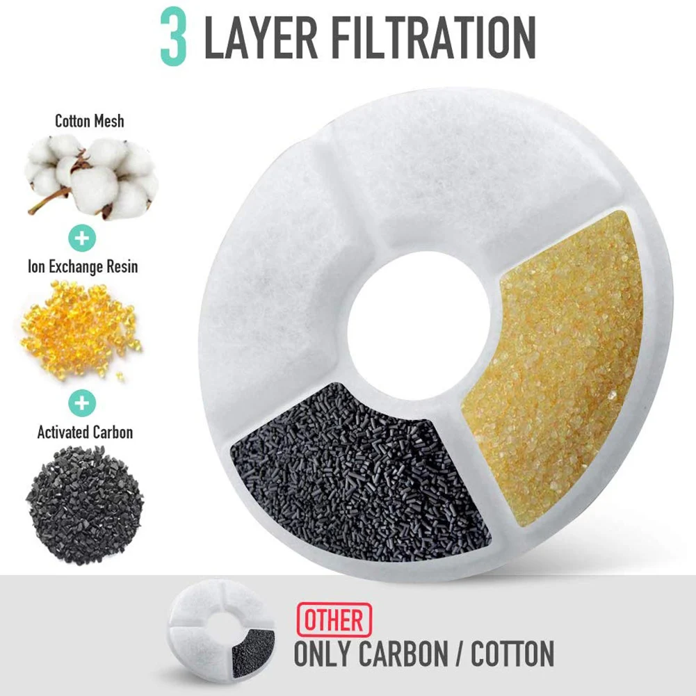 * 2. Качество воды может быть очищено тремя типами фильтрации (смола, активированный уголь, фильтровальная хлопковая ткань). Внешний слой полиэстера на каждом фильтре захватывает волосы и мусор. Три шага фильтрации могут обеспечить качество воды и улучшить вкус вашей милой кошки.