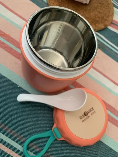 Термос пришел в хорошей упаковке, в целости, без сколов и трещин. Внутри была ложка, вроде как не очень нужно, но спасибо. Проверила кипятком - не течет, после часа в закрытом виде (для сравнения взяла термос почти того же объема с широким горлом - в нем температура была 85 градусов) со 100 градусов температура дошла до 70. Больше пока никак не могу протестировать, но донести завтрак теплым до работы вполне сгодится. Дизайн понравился.