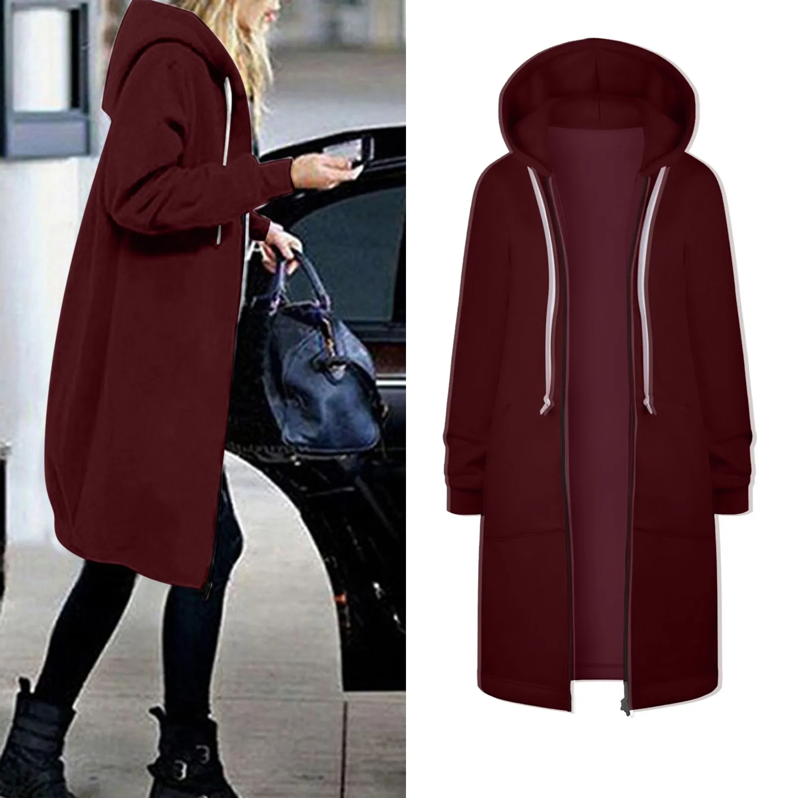 Женская теплая толстовка с капюшоном на молнии, длинное пальто, куртка, топы, верхняя одежда