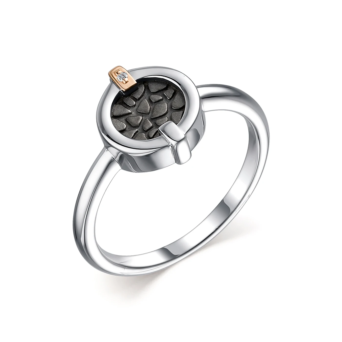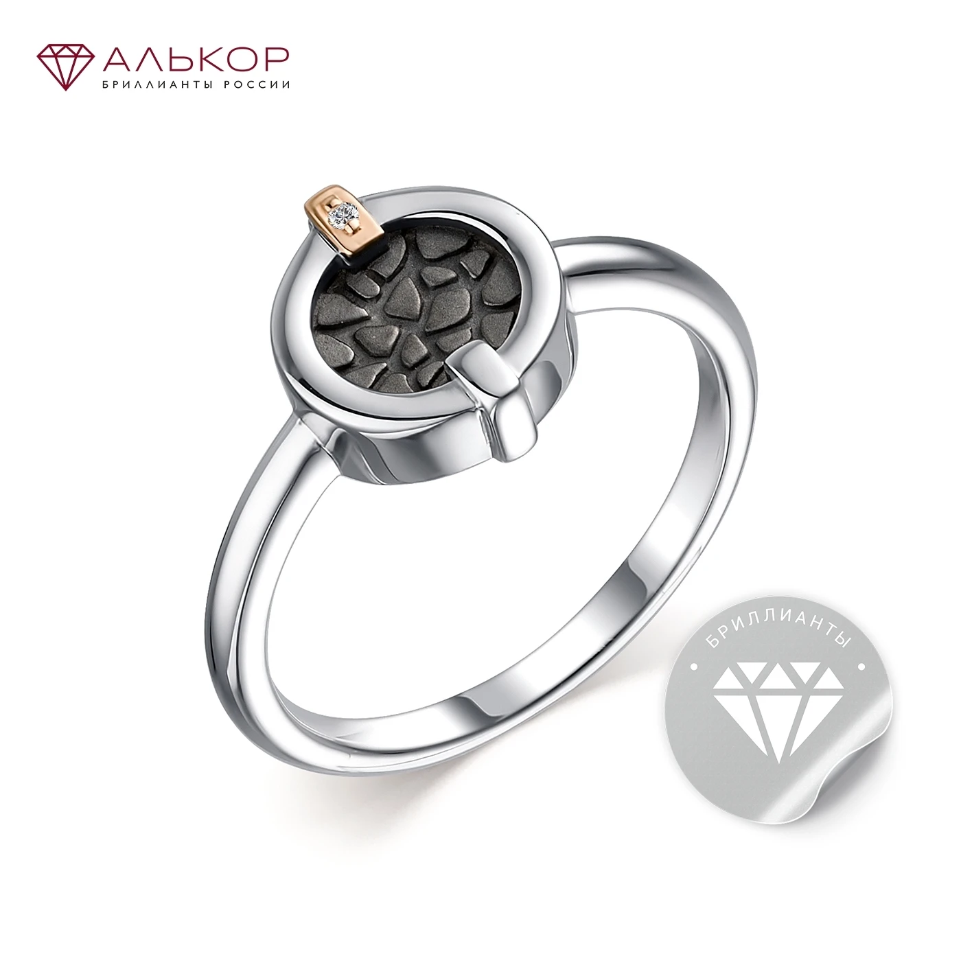 Ювелирное кольцо из родированного серебра и золота c бриллиантом АЛЬКОР. Бесплатная доставка с ювелирной фабрики в России. Мы покрываем серебро гипоаллергенным слоем родия толщиной 0,4 мкм, чтобы драгоценный металл получил благородный платиновый блеск и не потемнел со временем. В украшениях АЛЬКОР только природные бриллианты эталонной огранки из алмазов российского происхождения, подлинность которых подтверждается сертификатом. Вставка: 1 Бриллиант Круг 17 200-400 2/3А, карат. вес: 0,003. Ширина изделия: 10,6 мм.