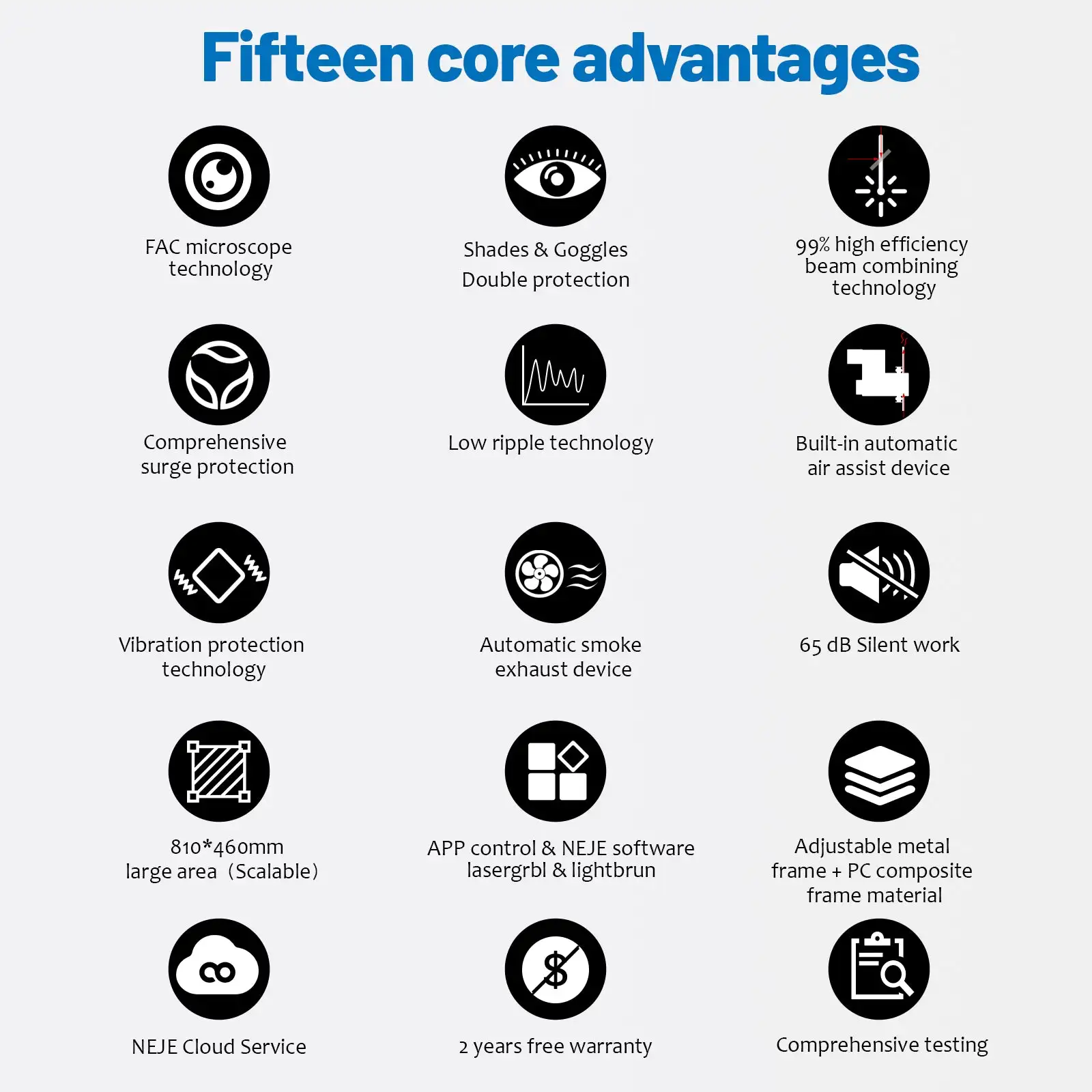 NEJE 3 Max-это профессиональное оборудование для лазерной гравировки и резки. Площадь 810x460 мм может удовлетворить большинство потребностей в гравировке и резке. Благодаря удлинительному стержню, обеспечиваемому NEJE, может быть получена Рабочая площадь 810x1030 мм. NEJE 3 серии все поддержка APP управление и точность контроля, до 0,01 мм, вы можете получить максимальную гравировка работает с помощью программного обеспечения, таких как приложение и Лайтберн. С полнофункциональным модулем NEJE A40640, он наиболее подходит для гравировки из нержавеющей стали, гравировки камня, искусства рельефа дерева, брезентового искусства большой площади, резки листа, акрила, ткани идеальный выбор. NEJE 3 Max оснащен автоматическим воздушным ассистентом, компонентами автоматического контроля дыма и расширенными функциями двери безопасности и совместим со всеми модулями серии NEJE. Расширенные функции идеально подходят для приложений Lightburn, laserGRBL и NEJE. Создайте идеальную систему лазерной гравировки и резки, NEJE 3 Max также поставляется с опциональной сотовой панелью, поддерживает все вращающиеся приспособления, улучшает качество резки и различные формы материалов. NEJE 3 Max всегда может принести шокирующие работы, а мощная возможность расширения-это обязательный инструмент для профессиональных любителей диодного лазера.