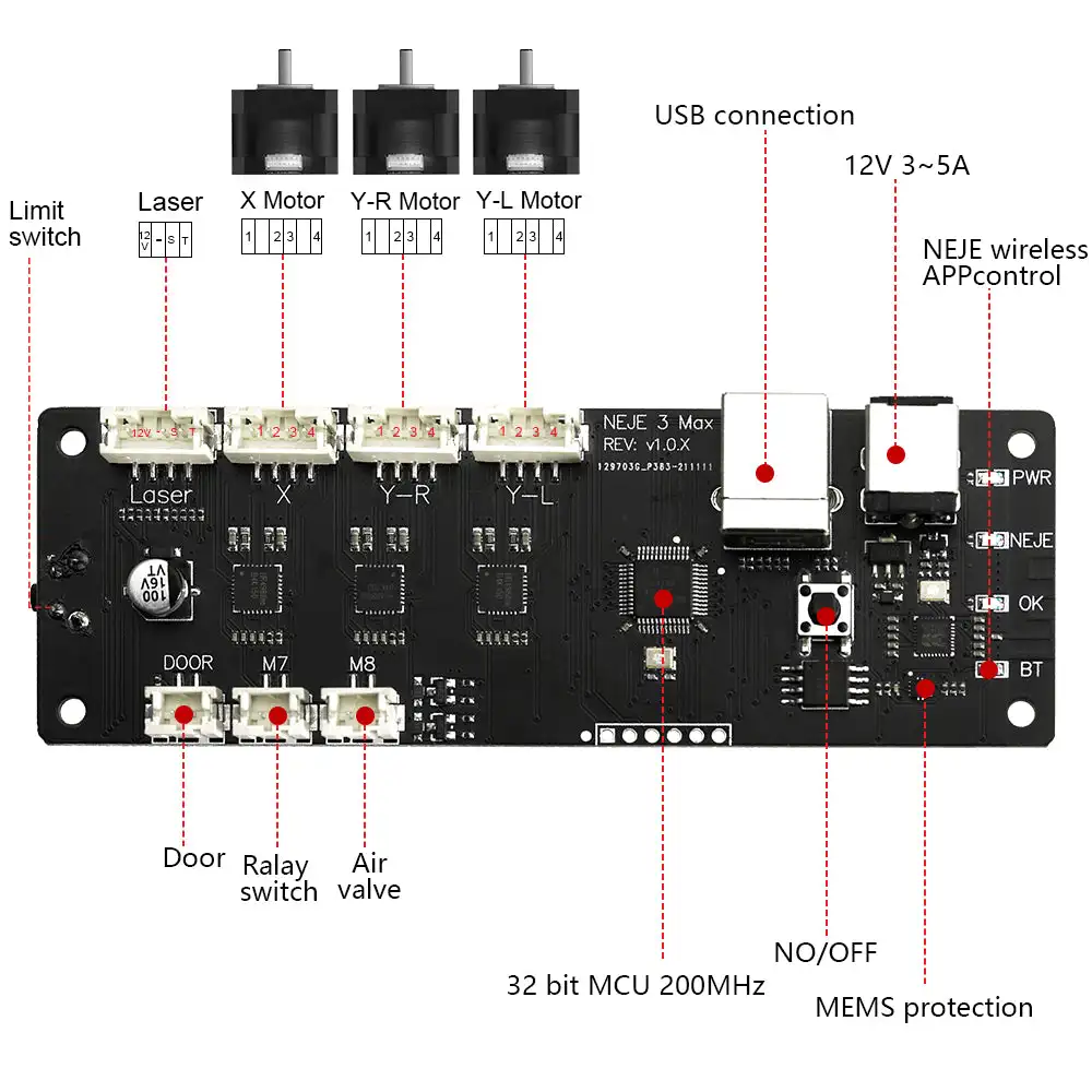 РамкаРазмер (Д-Ш-в): 590x980x160ммРабочая зона (X - Y): 810x460 мм, простирается до 810x1030ммТочка шаг: 0,075 мм, 338 точек/дюймПиксель: 6133x10800 pxПривод точность: 0,01 ммМаксимальная скорость движения: X:1000 мм/сек. (с модулем A40640 204g), Y:750 мм/сек.Материал оправы: Высокоточный полностью алюминиевый сплав и гибридная рамка из поликарбонатаТехнология конструкции: ось Y, регулируемая конструкция, ось X, напряжение в сбореХарактеристики конструкции: посадка, высокая точность, стабилизация, гладкая, без масла, простота обслуживания, длительный срок службыВертикальная резьба: Да (45 °)Размер двигателя: 42x42x34 ммТок привода двигателя: 0.9AРегулятор высоты модуля: ДаДом: задний левыйПроисхождение: передняя леваяСовместимые модули: все NEJE 4pin лазерные Moudle, включая E40 24V лазерный модуль (материнская плата выше v1.1.0)MCU: 32 бит 200 МГц MCU на подкладке для ребенка (верх и низ 32-битный MCU)Управление приложением BLE: ДаMEMS Защита: даУправление M7: Да (для строительства автоматических систем извлечения дыма)Управление M8: Да (для строительства автоматических систем воздушной помощи)Контроль двери: Да (Аварийная подвеска и контроль безопасности двери)Ограничительный переключатель: ДаПереключатель ВКЛ/ВЫКЛ: ДаВход: DC 5,5 2,1, 12V 5A (адаптер питания)Система: Win 7 / Win 8/ Win 10, Android, iOS, ipadOS, macOS, HarmonyOS.Формат файлов поддерживает: SVG/DXF/JPG/JPEG/PNG/BMP/TIF/CR2 и т. Д.Обновление OTA: ДаПрограммное обеспечение NEJE Win: Да, рекомендуется открыть программное обеспечение NEJE для обновления последней прошивки в первый раз.Светильник burn and LaserGRBL: Да, Улучшенная функция низкий светильник, добавлен M8, M7, аварийный стоп расширенное автоматическое управление, оптимизированное взаимодействие GRBL.Автономная работа: Да, в программном обеспечении NEJE Win и приложении NEJE, когда изображение переносится на устройство, оно может работать независимо от компьютера или мобильный телефон.Повторная гравировка: Да, после завершения гравировки или резки устройство не потеряет информацию о местоположении, если вы не удовлетворены работой, вы можете продолжать работать.Приложение NEJE Android: ДаПриложение NEJE для iphone/iPad: ДаNEJE облачная галерея сервис: ДаЗагрузка программного обеспечения: Https:/neje.wikiМодуль: NEJE A40640Фокус: 0.04x0.06ммМетод фокусировки: регулируемый (рекомендуется 30-55 мм)Оптическая мощность: CW 10 Вт +, Pulse 12 ВтГравюра серого цвета из нержавеющей стали: Да3D гравировка твердой древесины: ДаМаксимальная толщина резки: 20 ммДлина волны: 450нмВес: 204 гРазмер модуля: 40x50x85 ммВход: DC 12V 4AИнтерфейс: 4pin PH2.0Совместимость с: NEJE 3 Max, NEJE 3 Pro, NEJE 3 Plus, NEJE 2s Max, NEJE 2s Plus и т. д.Управление питанием: мощности с ШИМ модуляцией мощностиВентилятор: вентилятор с двумя шарикамиПривод: NEJE smart quiet Drive, встроенная технология статического устранения.Защита от перенапряжения: ДаУмные Отзывы: ДаОтзывы о температуре: ДаКонтроль температуры: 45 ℃Воздушный насос: 0,5-1.5mpa чистого воздуха (воздушный регулирующий клапан из сопла поддерживает жирной и водосодержащих, использующий теплоту воздуха, и герметичный воздушные сопла можно использовать только чистый воздух насоса)Воздушный Интерфейс: 4 мм pvc tracheaСменная Конструкция объектива: ДаОригинальный зарегистрированный бренд: ДаГарантия: 2 годаГарантия: условия свободной послепродажной политики NEJE должны быть выполнены в условиях нечеловеческой разборки, неправильной эксплуатации и использования в правильной среде.Если неправильное напряжение вх
