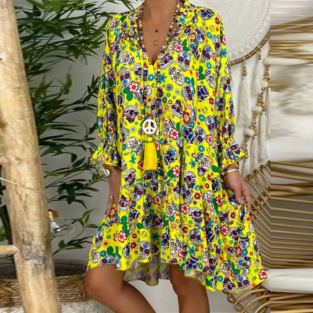 Женское свободное мини-платье с принтом и длинным рукавом, v-образным вырезом и пуговицами размера плюс