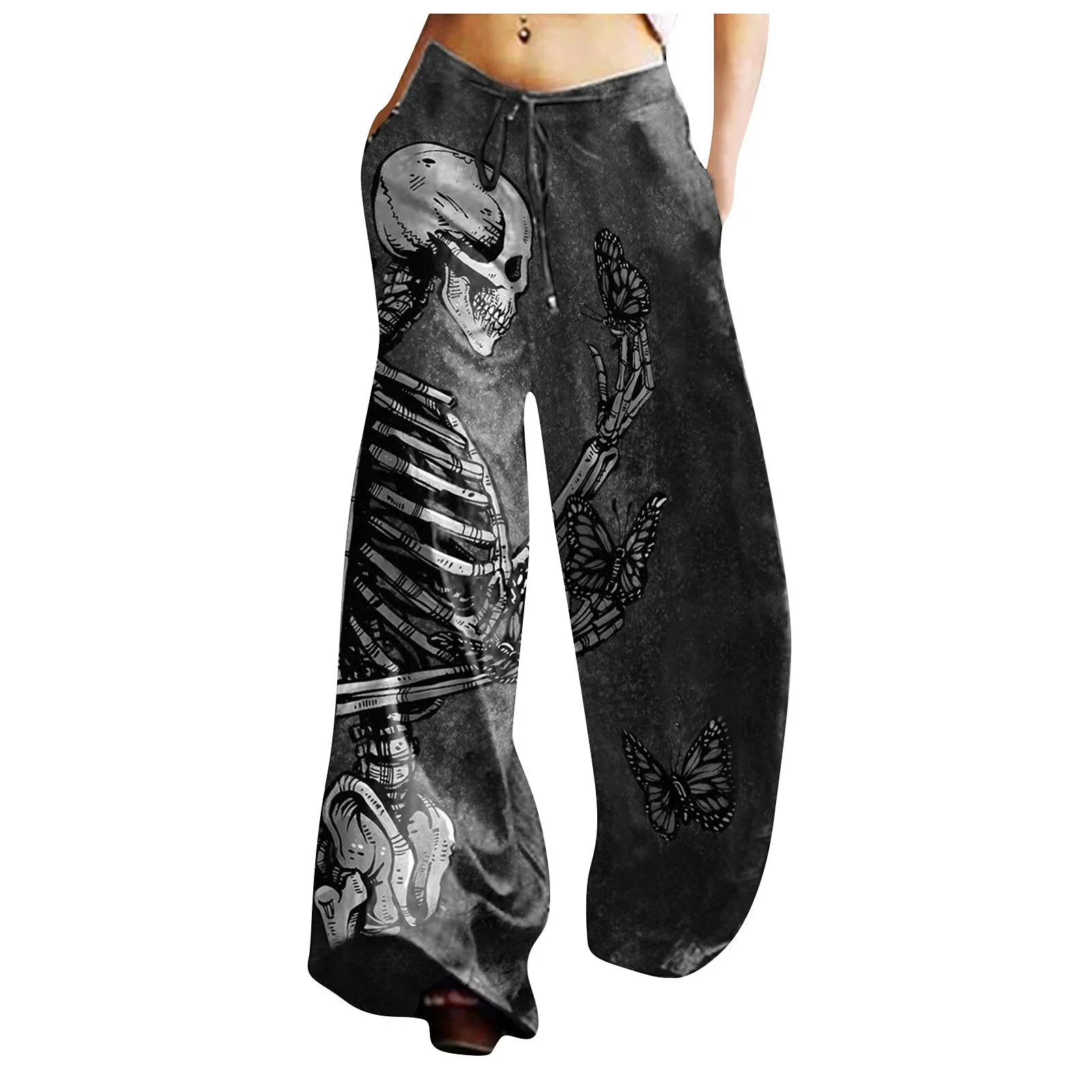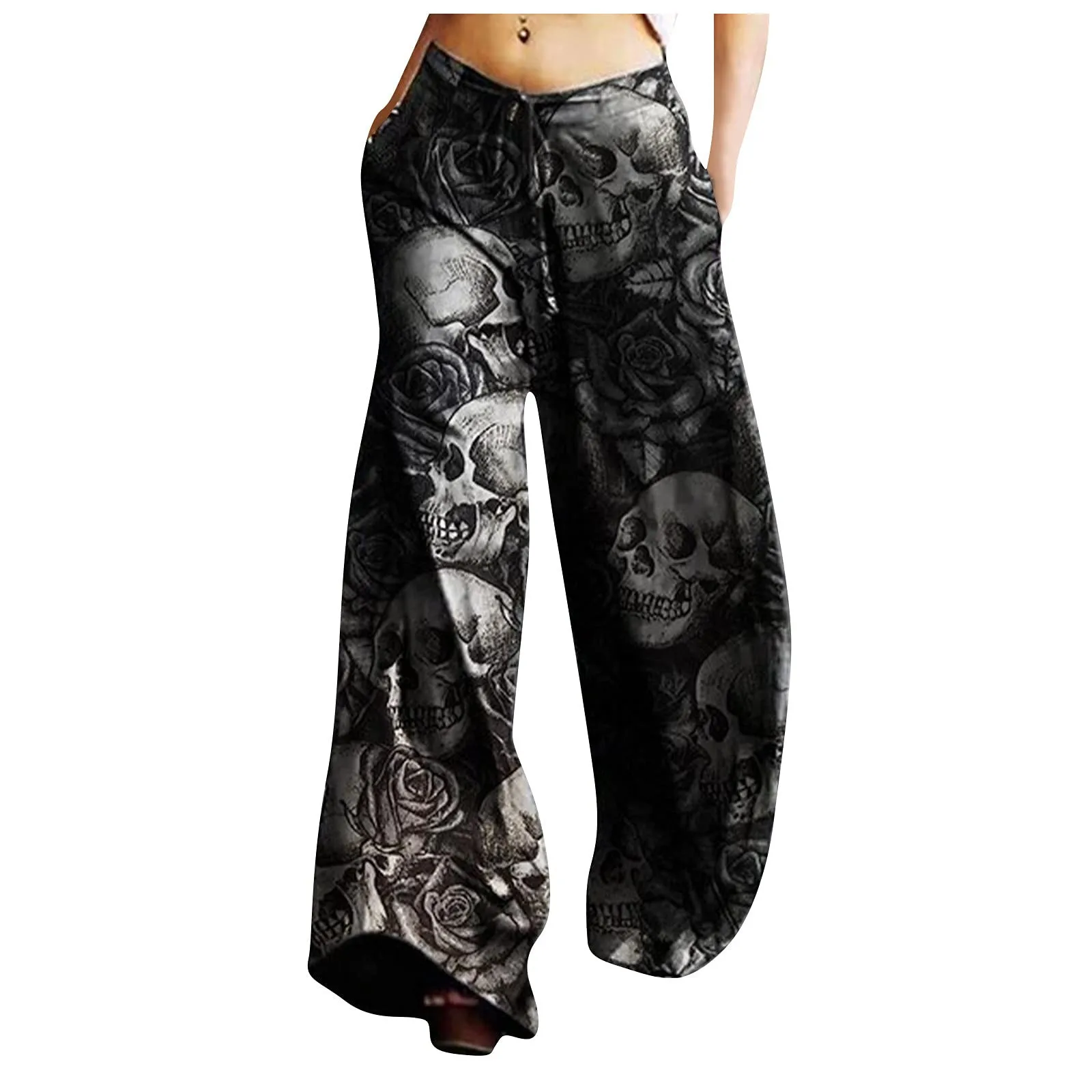 Женские штаны на Хэллоуин с принтом черепа, высокая талия, повседневные свободные штаны с широкими штанинами и карманами