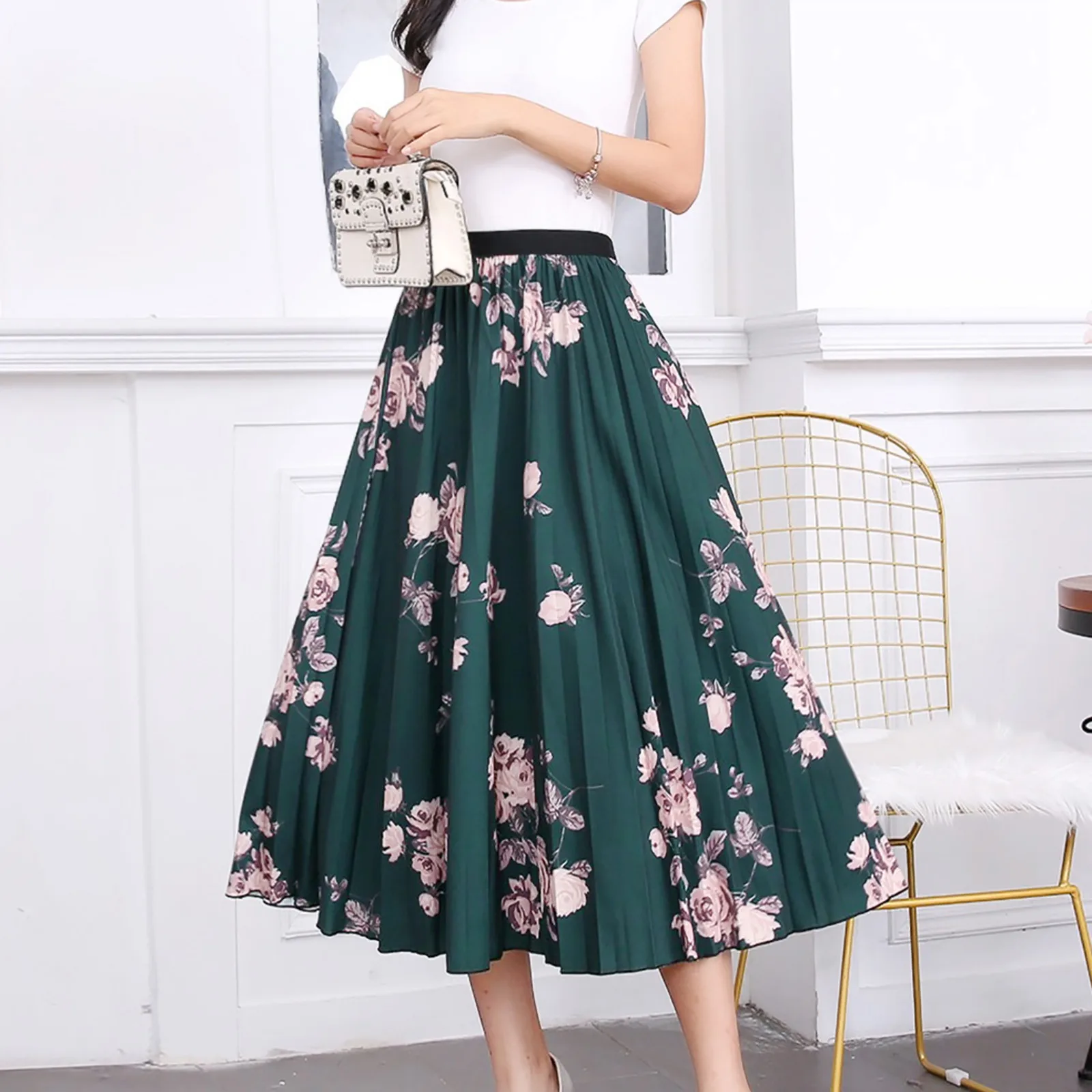 Женская юбка средней длины с принтом, юбка А-силуэта с эластичным поясом и плиссированным широким подолом, модная юбка в Корейском стиле, 2021