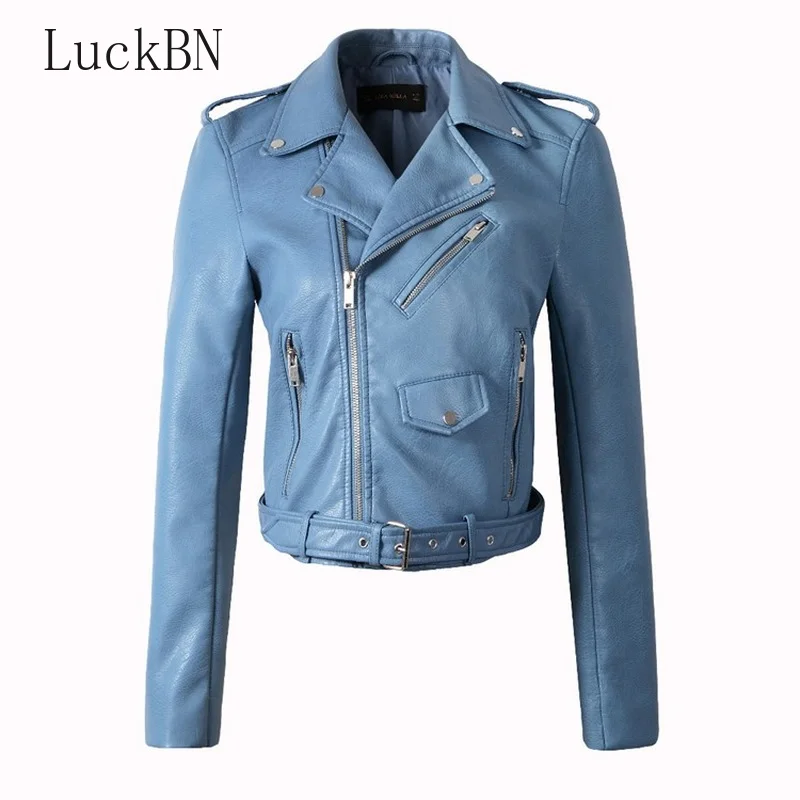 Женская демисезонная куртка из искусственной кожи, черная или синяя мотоциклетная верхняя одежда из искусственной кожи на молнии с карманами и поясом, новинка 2021