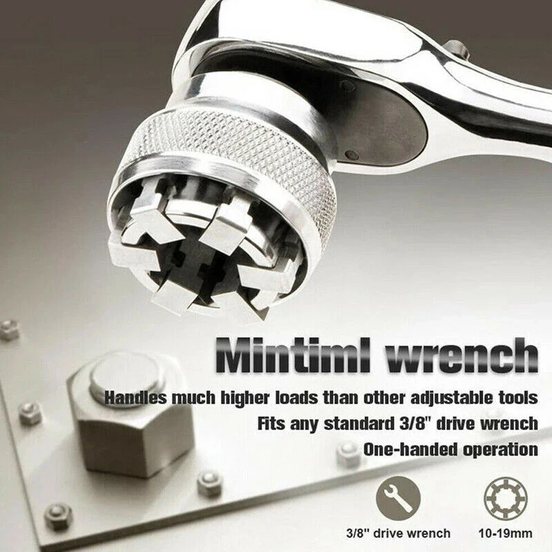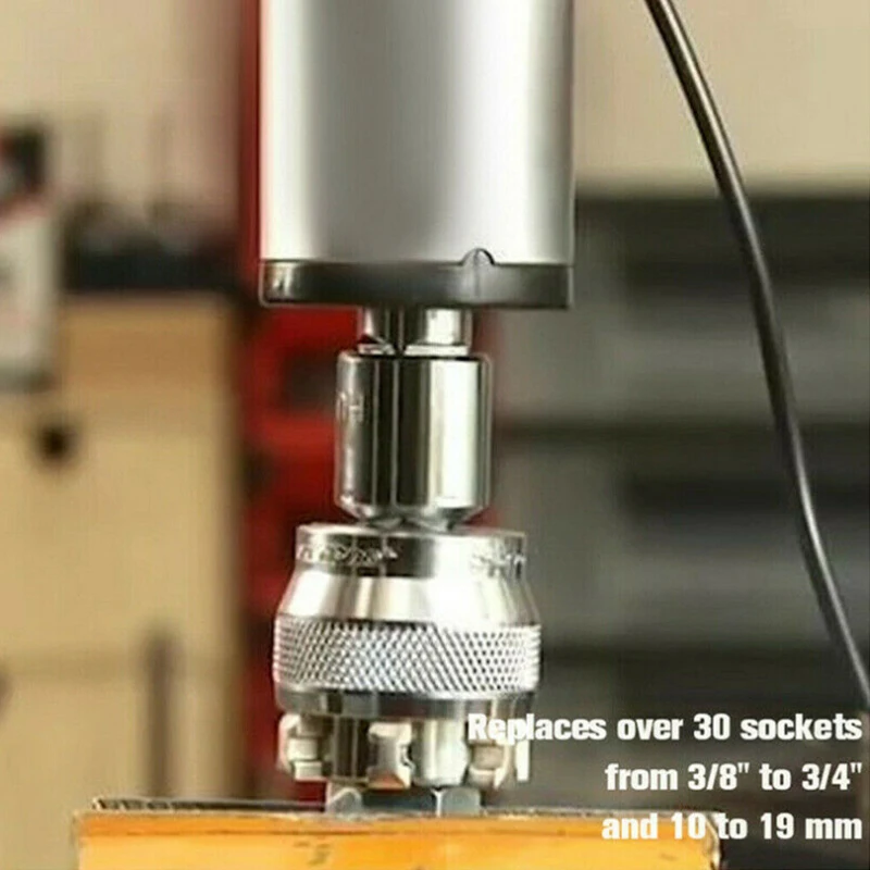 Адаптивный гаечный ключ заменяет более 30 розеток от 3/8 до 3/4 и от 10 до 19 мм.